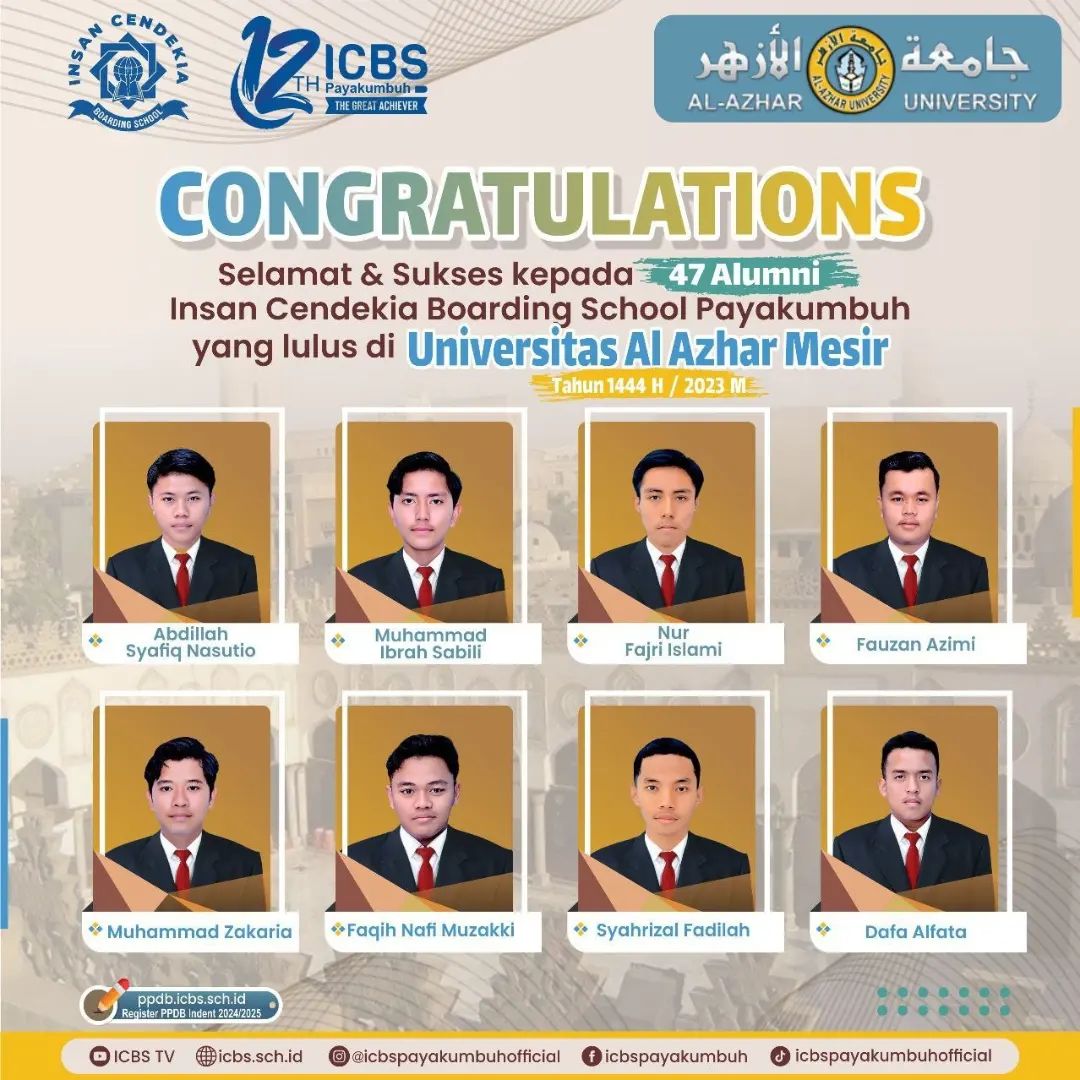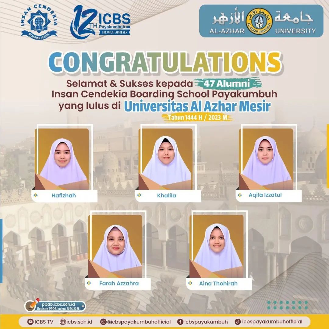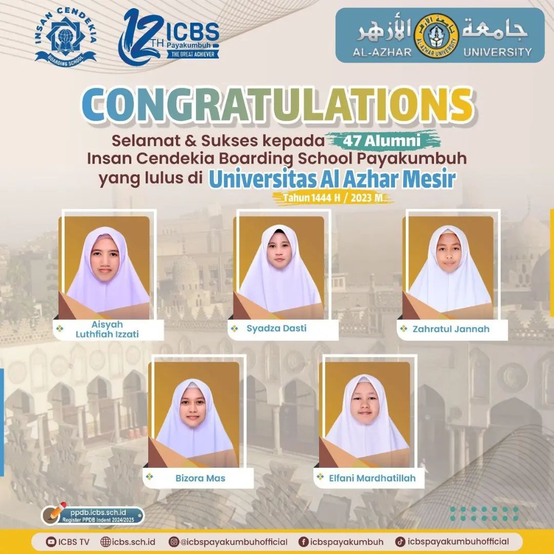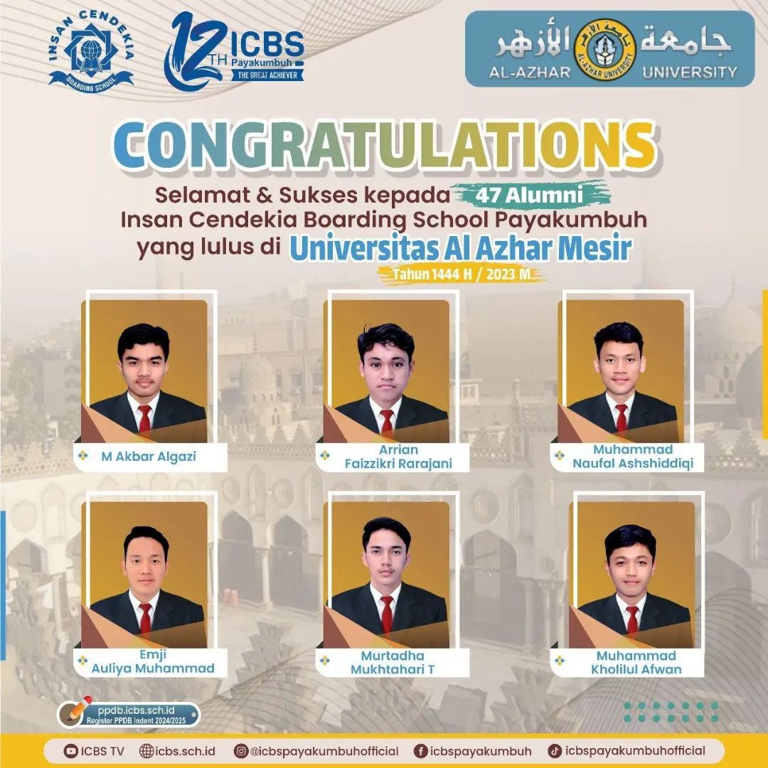 Atas izin Allah Ta’ala, _47 orang santri SMA Insan Cendekia Boarding School pada tahun akademik 2022-2023 dinyatakan diterima sebagai mahasiswa pada universitas Al Azhar, Mesir_, sebuah kampus tertua dan ternama kebanggaan umat Islam di Seluruh Dunia.