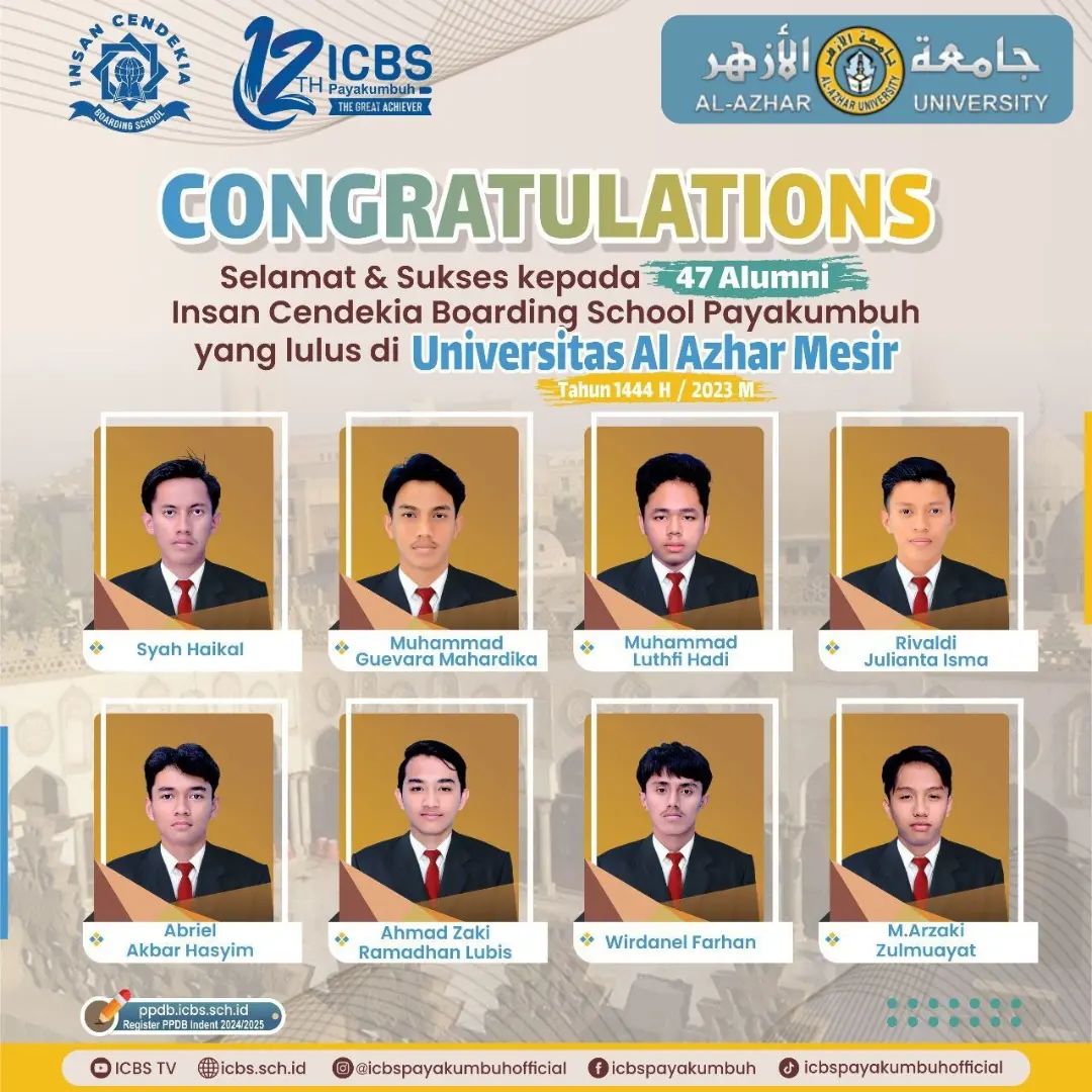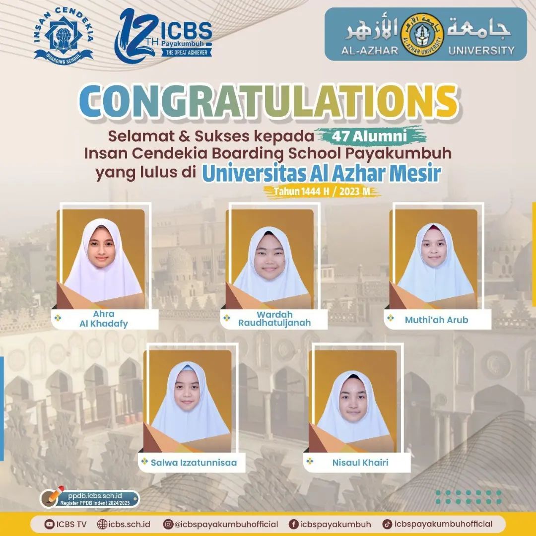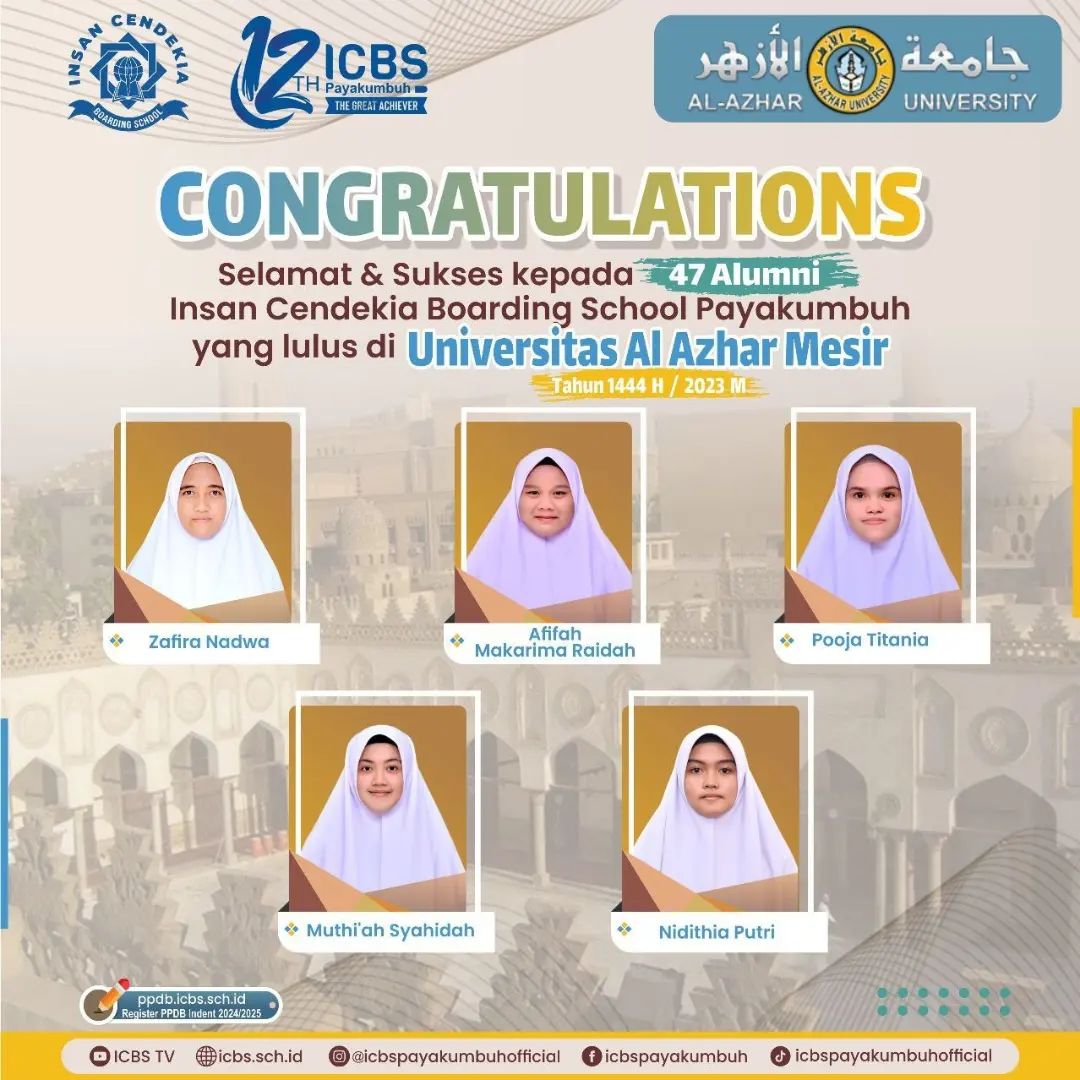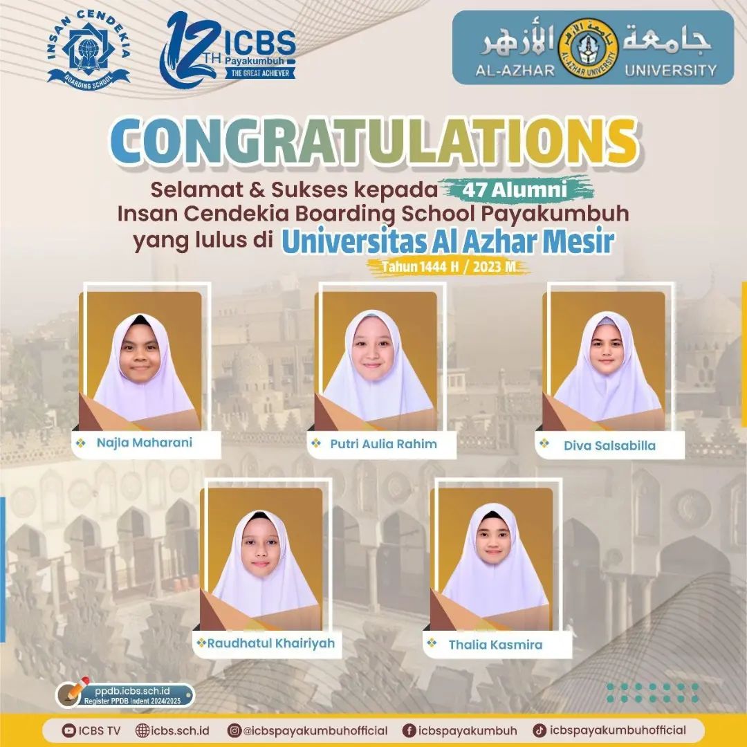 Atas izin Allah Ta’ala, _47 orang santri SMA Insan Cendekia Boarding School pada tahun akademik 2022-2023 dinyatakan diterima sebagai mahasiswa pada universitas Al Azhar, Mesir_, sebuah kampus tertua dan ternama kebanggaan umat Islam di Seluruh Dunia.