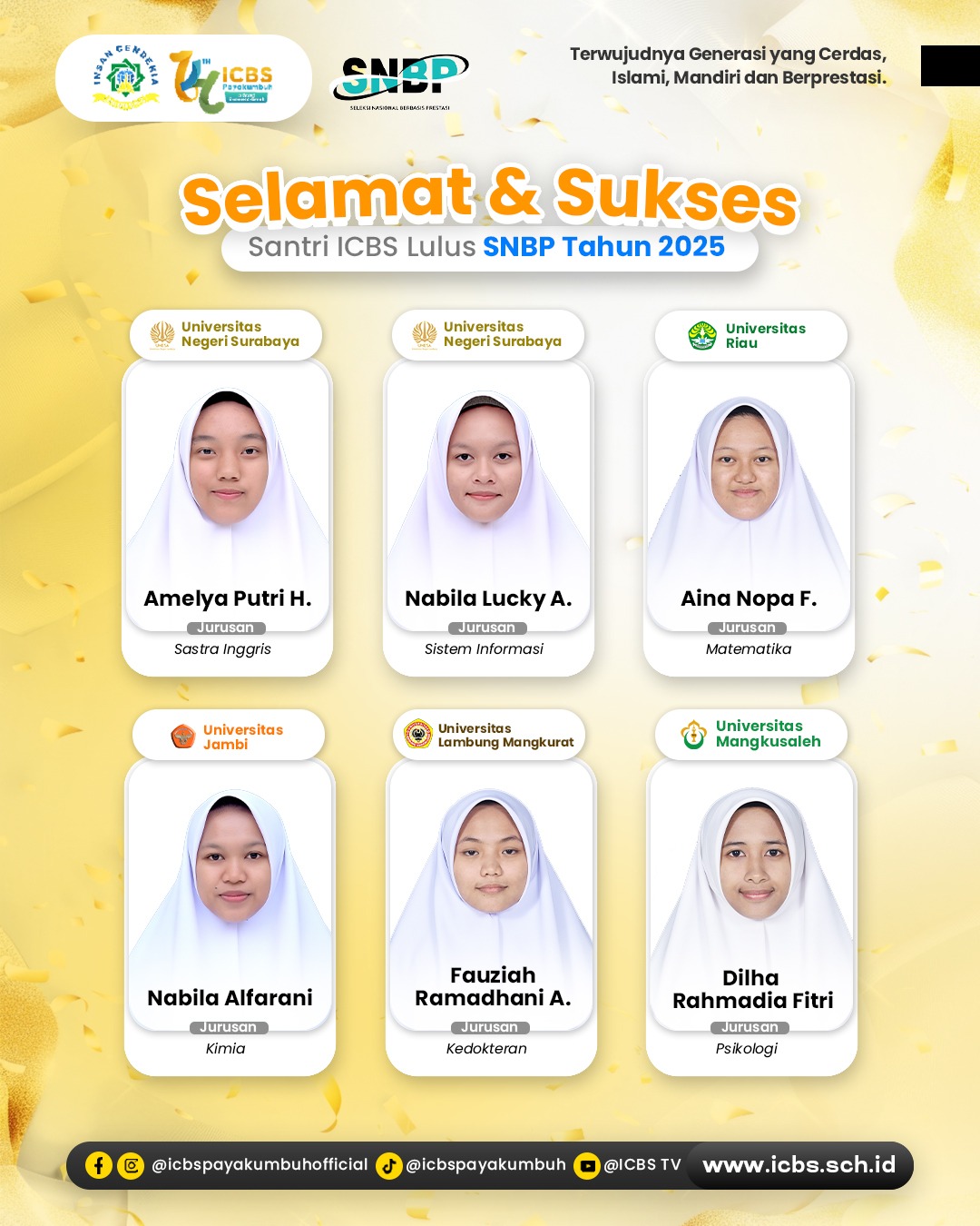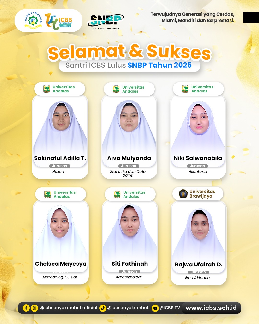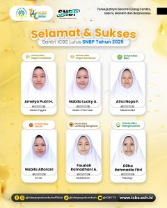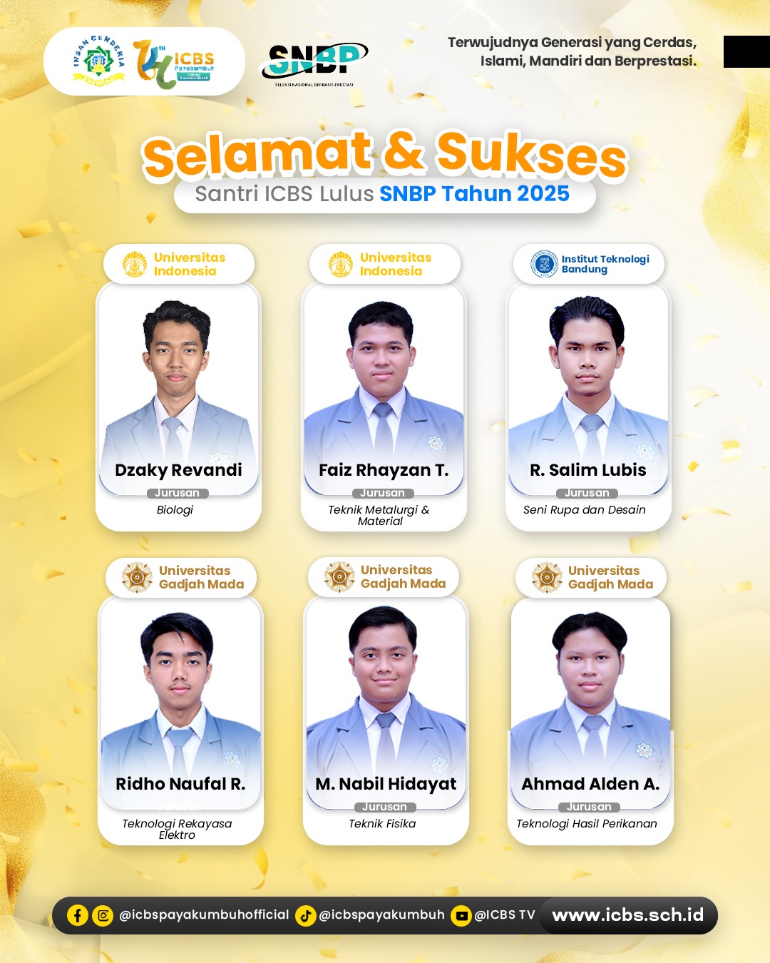 Kabar gembira! Sebanyak 60 santri ICBS berhasil lolos Seleksi Nasional Berdasarkan Prestasi (SNBP) 2025 dan diterima di berbagai kampus unggulan di Indonesia!