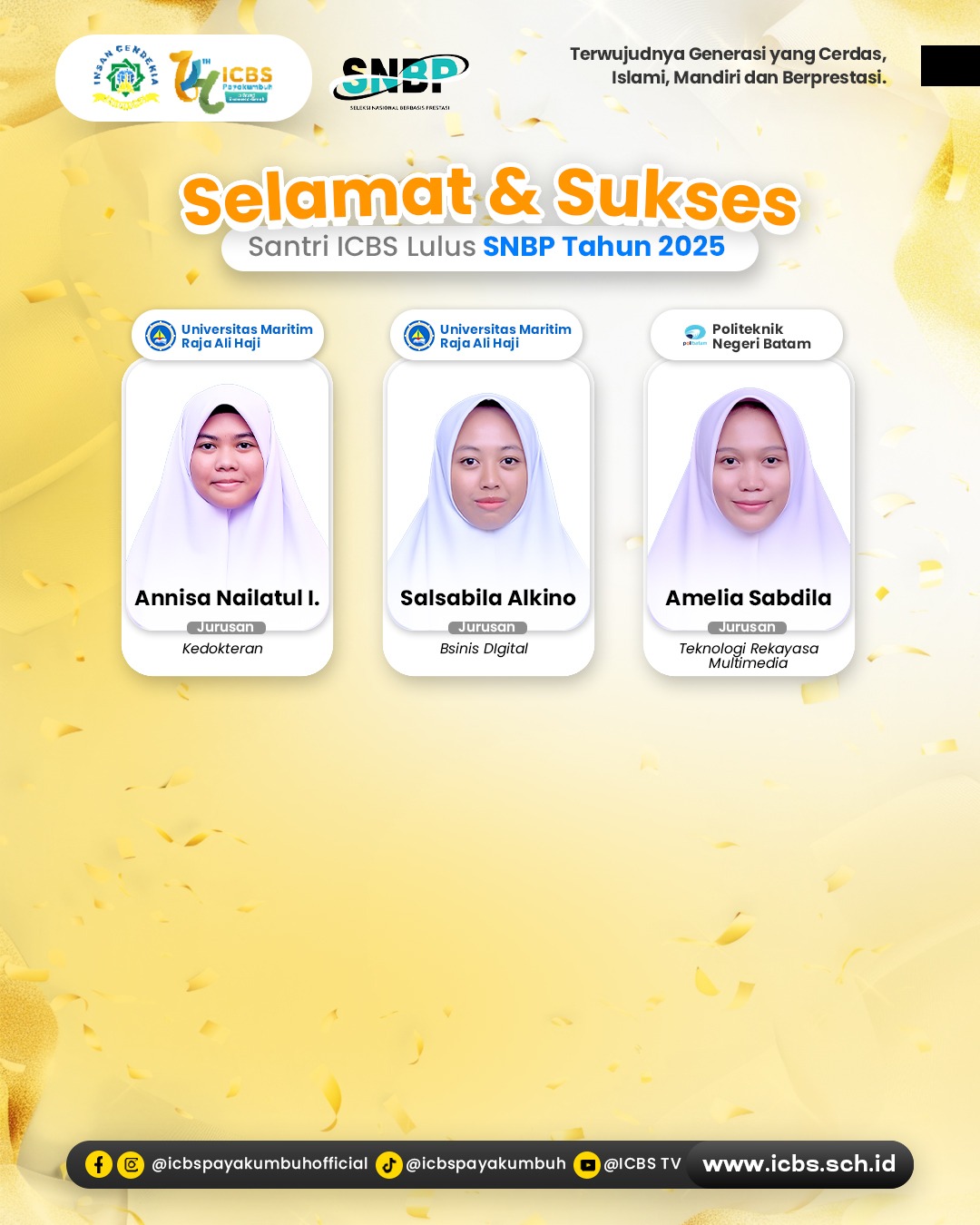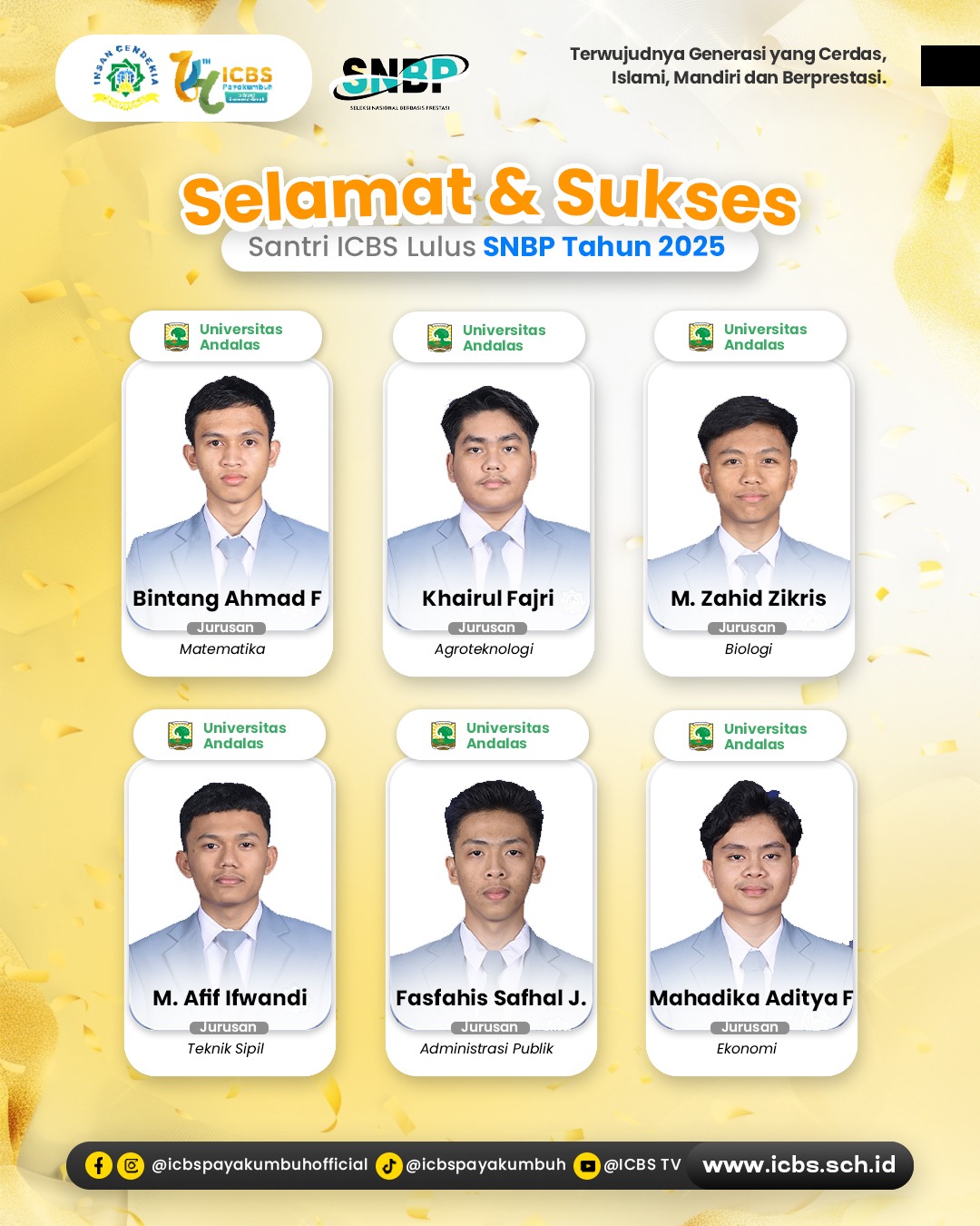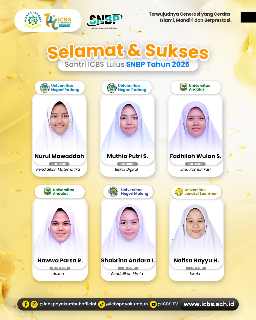 Kabar gembira! Sebanyak 60 santri ICBS berhasil lolos Seleksi Nasional Berdasarkan Prestasi (SNBP) 2025 dan diterima di berbagai kampus unggulan di Indonesia!