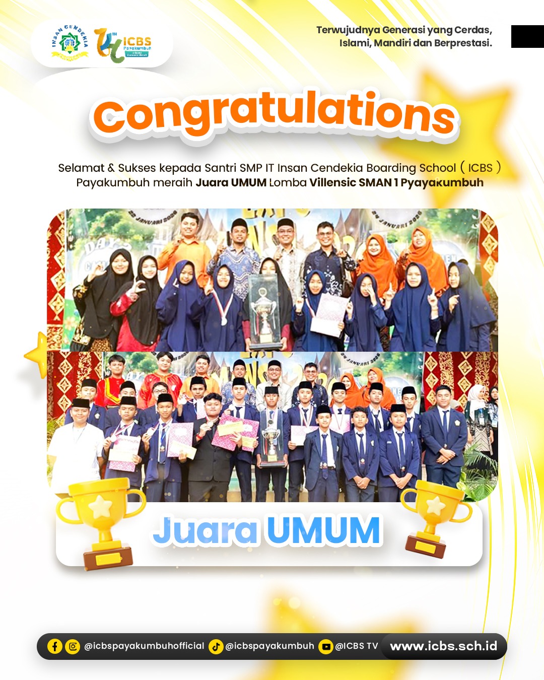 Kabar gembira dari ajang Lomba Villensic SMAN 1 Payakumbuh! Berkat kerja keras, doa, dan dukungan semua pihak, santri-santri terbaik ICBS berhasil membuktikan kualitasnya dengan meraih predikat JUARA UMUM! 🥇✨