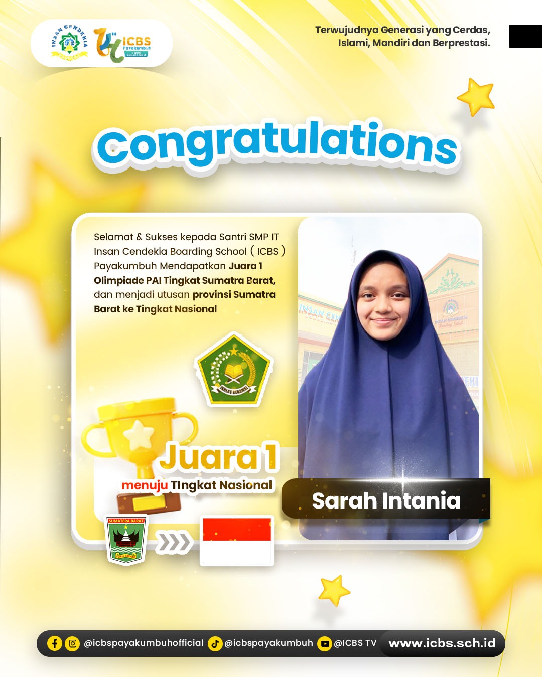 Selamat dan barakallah untuk ananda SARAH INTANIA yang berhasil meraih Juara 1 Olimpiade PAI Tingkat Sumatera Barat!