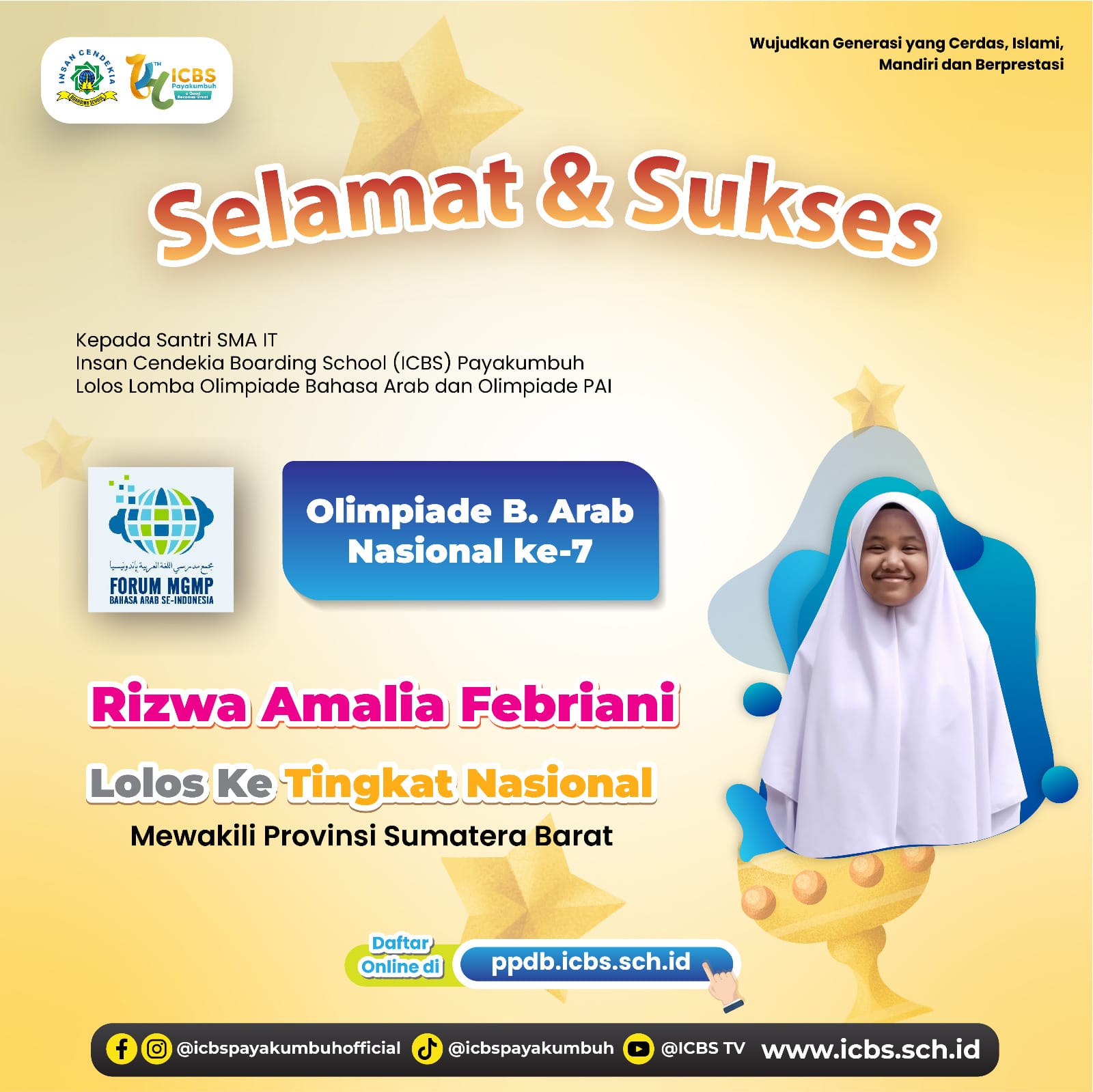 ✨ Rizwa Amalia Febriani – Lolos ke tingkat nasional mewakili Provinsi Sumatera Barat dalam Olimpiade Bahasa Arab Nasional Ke-7