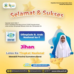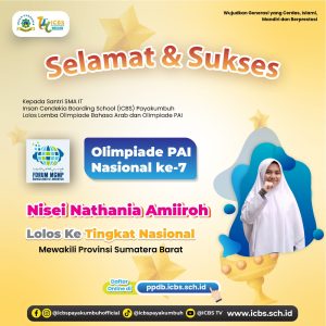 Dengan rasa syukur dan kebanggaan yang mendalam, kami mengucapkan selamat kepada empat santri luar biasa dari SMA IT Insan Candekia Boarding School (ICBS) Payakumbuh yang telah berhasil lolos ke tingkat nasional dalam Olimpiade Bahasa Arab dan Olimpiade PAI Nasional Ke-7!