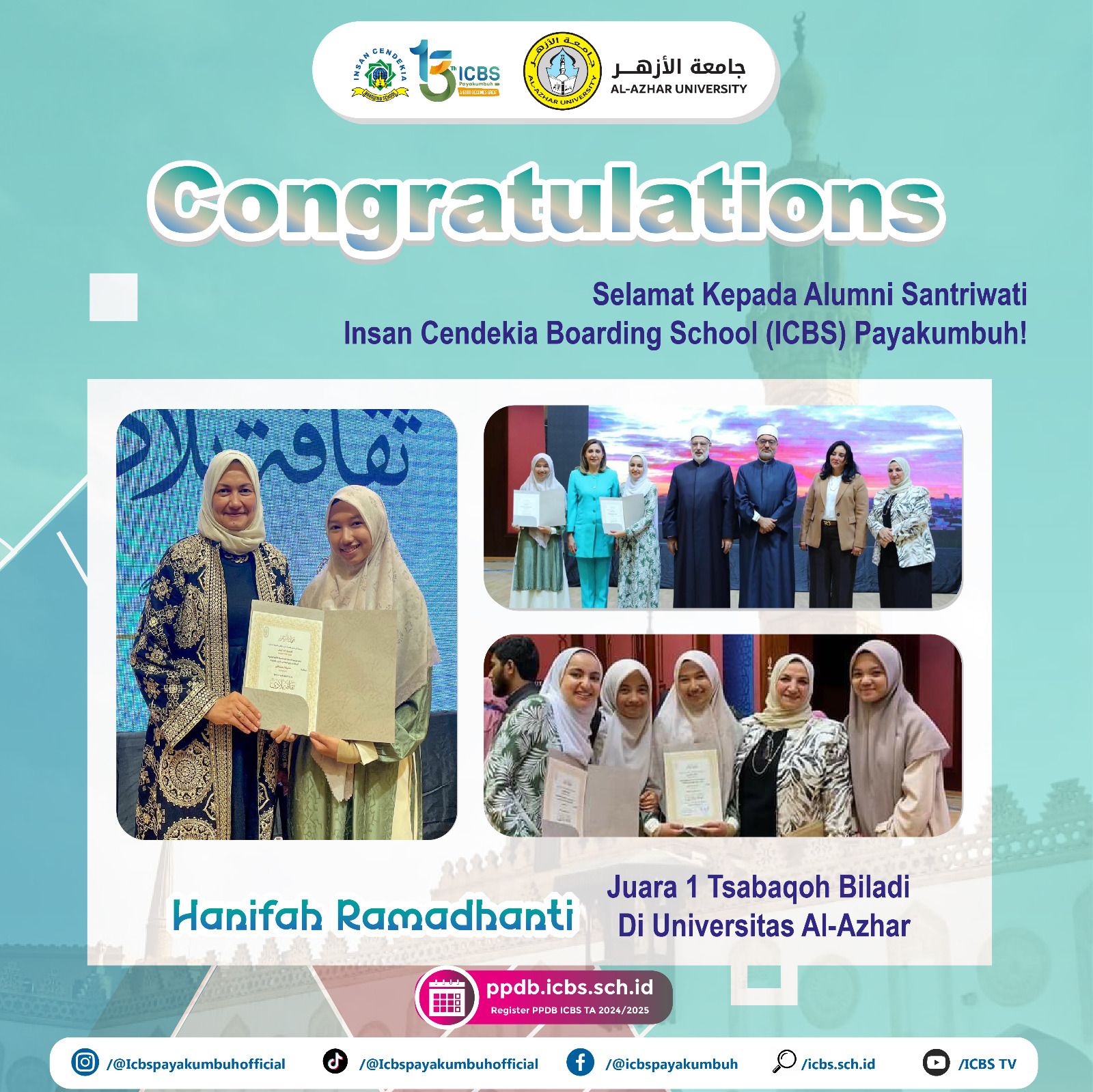 “No one care that much about our journey, focus on our path” adalah Motto hidup yang selalu memacu semangat seorang Hanifah Ramadhanti untuk terus berprestasi. Hanif, sapaan akrabnya, merupakan alumnus ICBS komplek Ummul Quro, Lampasi yang sekarang merupakan mahasiswa di Universitas Al Azhar Mesir.