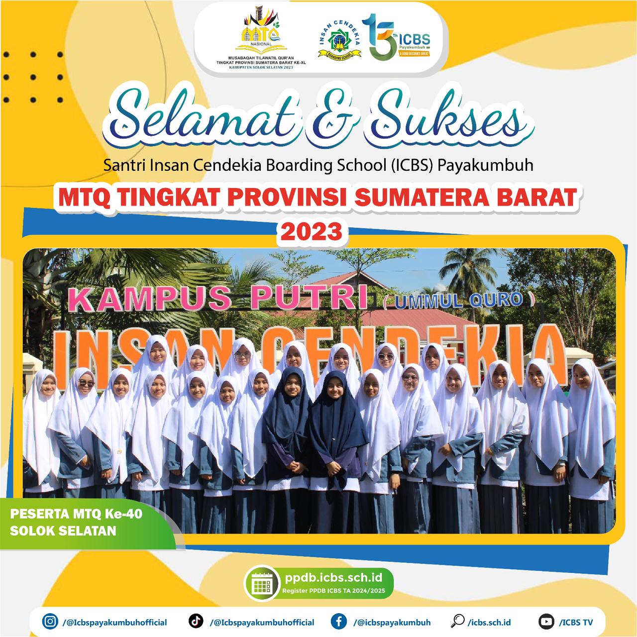 Insan Cendekia Boarding School (ICBS) merupakan lembaga pendidikan yang terkenal akan prestasinya dalam menghasilkan santri terbaik, termasuk dalam mengikuti Musabaqah Tilawatil Quran (MTQ). Pada tahun 2023, ICBS berhasil melepas 43 santri terbaiknya untuk mengikuti MTQ ke-40 di Kabupaten Solok Selatan.