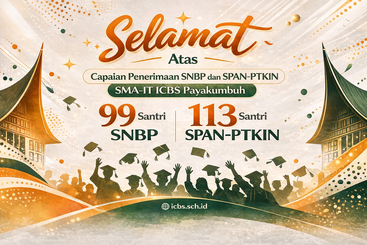 Payakumbuh — Kabar membanggakan kembali datang dari Insan Cendekia Boarding School (ICBS) Payakumbuh. Pada tahun 2026, ICBS mencatatkan prestasi luar biasa dengan 99 santri SMA-IT ICBS dinyatakan lulus melalui jalur SNBP dan tersebar di 32 Perguruan Tinggi Negeri (PTN) di seluruh Indonesia. Tak hanya itu, sebanyak 113 santri lainnya juga berhasil lolos melalui jalur SPAN-PTKIN dan diterima di berbagai Universitas Islam Negeri (UIN) di seluruh Indonesia.