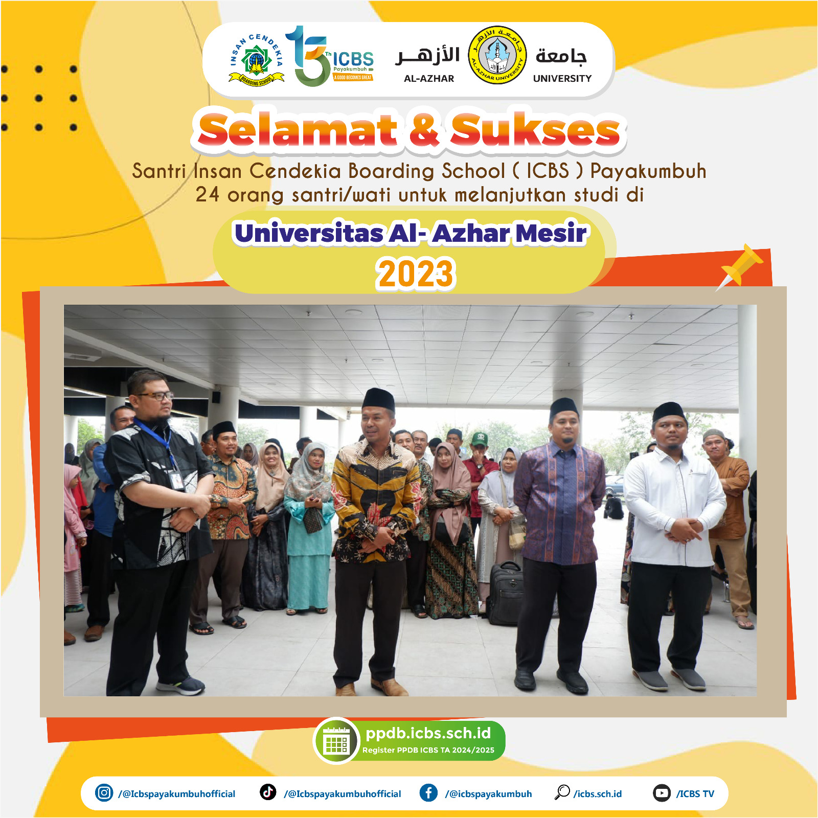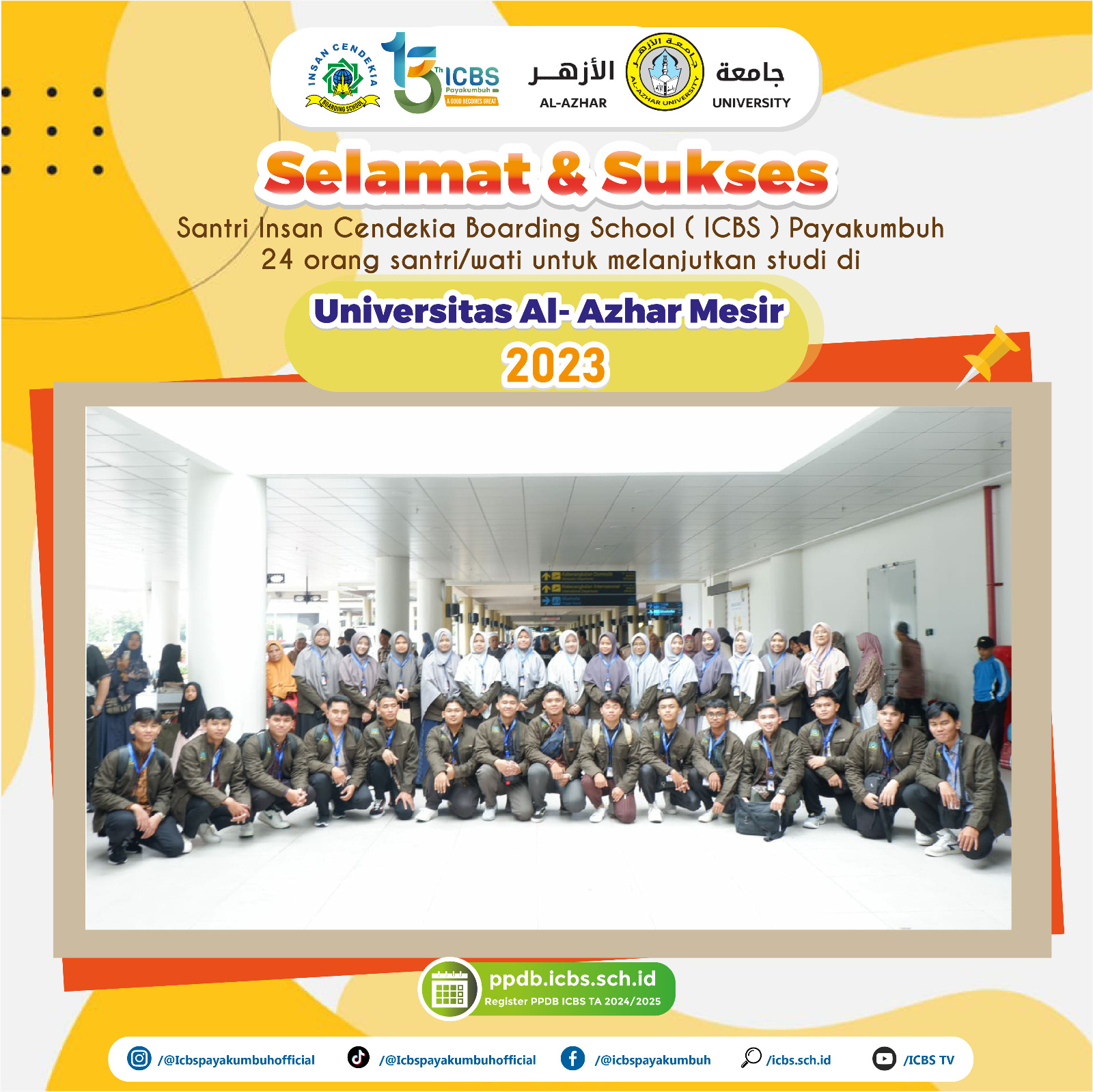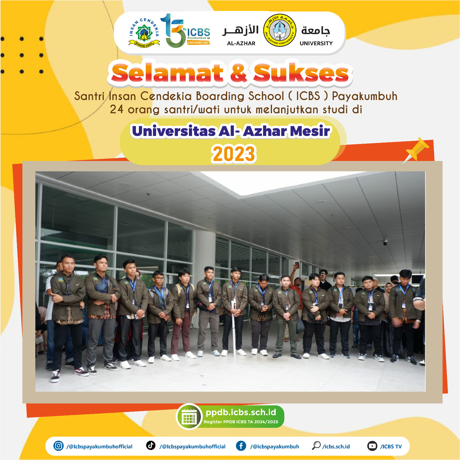 Pada hari Rabu, 6 Desember 2023, sebanyak 24 santri Insan Cendekia Boarding School dilepas untuk menempuh pendidikan di Al Azhar, Mesir. Pelepasan dilakukan di Bandara Internasional Minangkabau. Turut hadir dalam pelepasan santri jajaran pimpinan ICBS, Ustd Roni Patihan, Lc, Ustd Okta Veldi Andika, Lc,. MH , Ustd Ihsan Ahmad, Lc,MA, dan Ustd Zulherman Syafril, S.Pd.I.