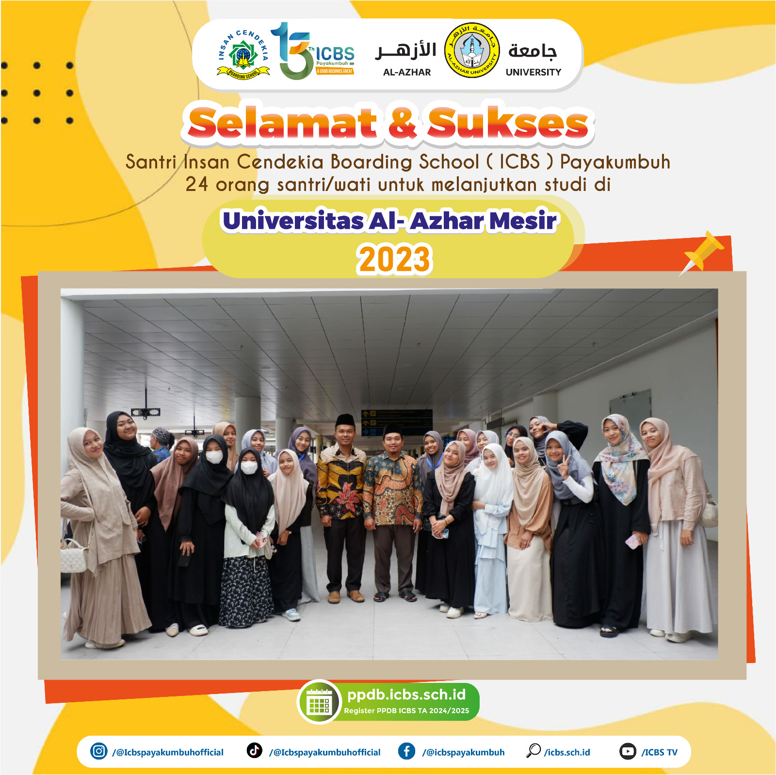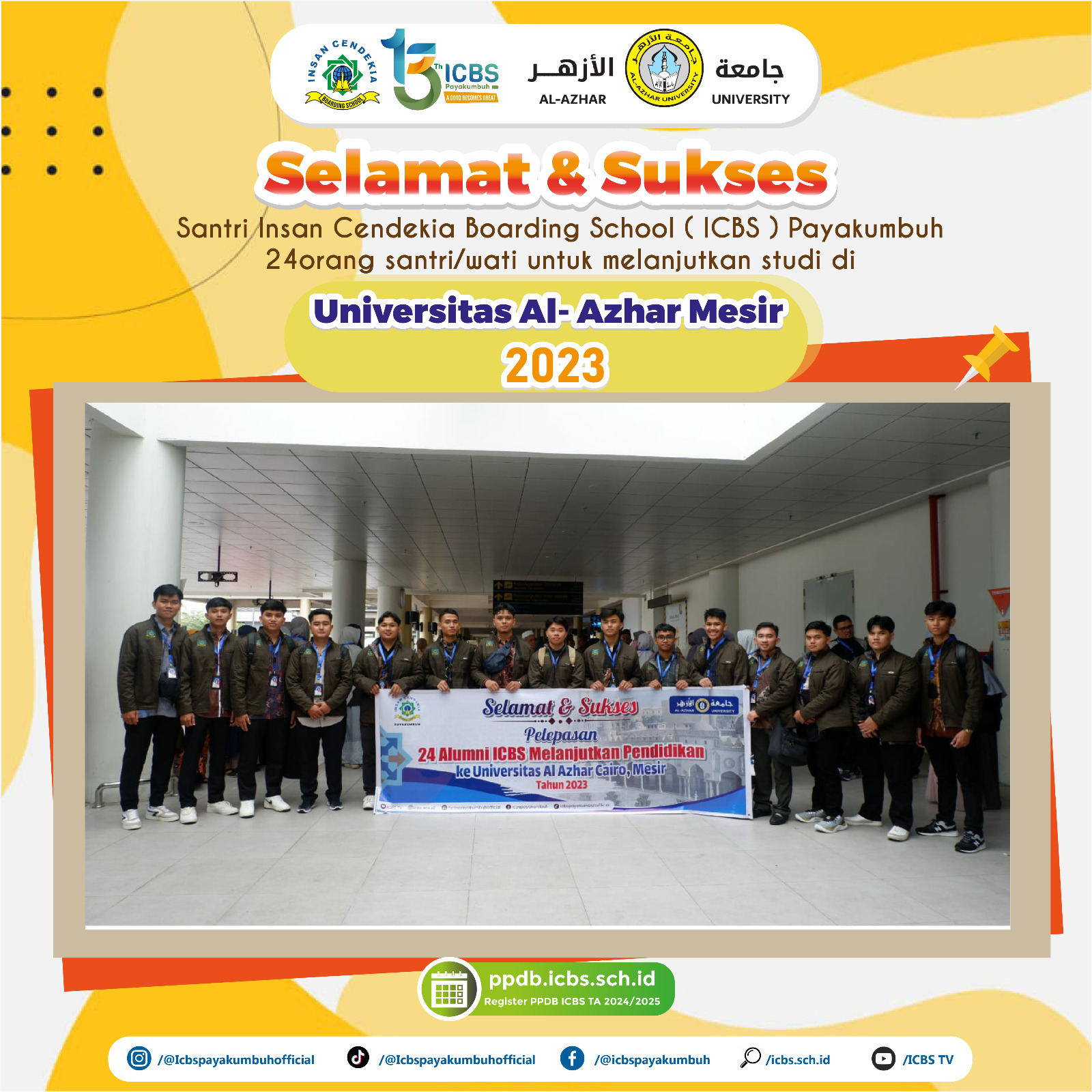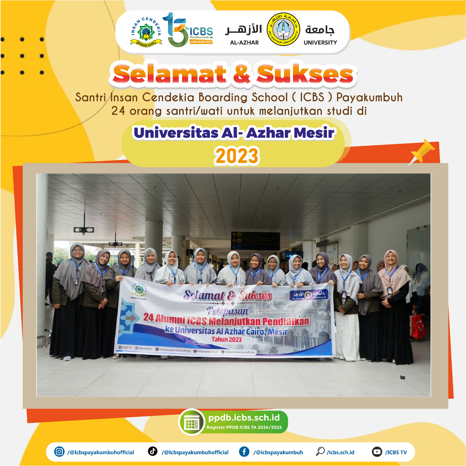 Pada hari Rabu, 6 Desember 2023, sebanyak 24 santri Insan Cendekia Boarding School dilepas untuk menempuh pendidikan di Al Azhar, Mesir. Pelepasan dilakukan di Bandara Internasional Minangkabau. Turut hadir dalam pelepasan santri jajaran pimpinan ICBS, Ustd Roni Patihan, Lc, Ustd Okta Veldi Andika, Lc,. MH , Ustd Ihsan Ahmad, Lc,MA, dan Ustd Zulherman Syafril, S.Pd.I.