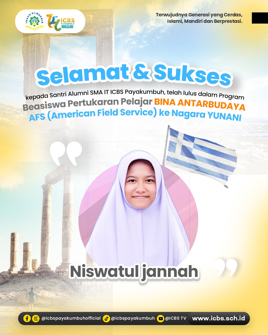 Salah satu ananda terbaik kita, Niswatuljannah Al’afifah dari kelas XI.14, lulus Program Bina Antarbudaya AFS (American Field Service) dan akan berangkat ke Yunani tahun 2025 mendatang!