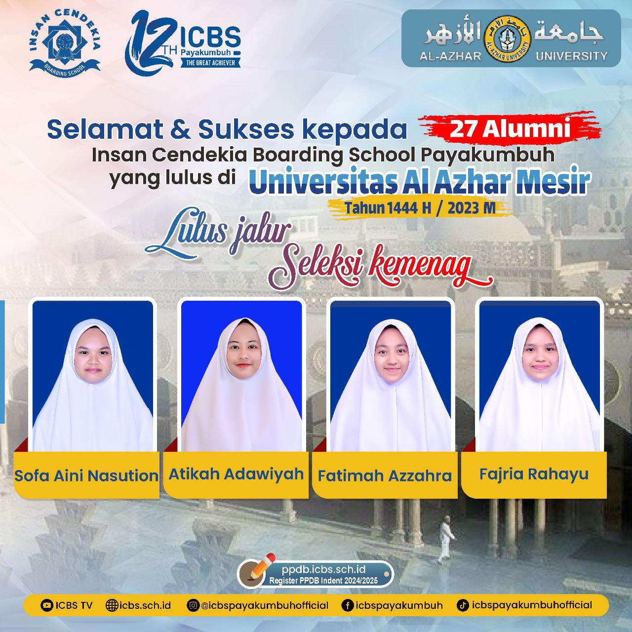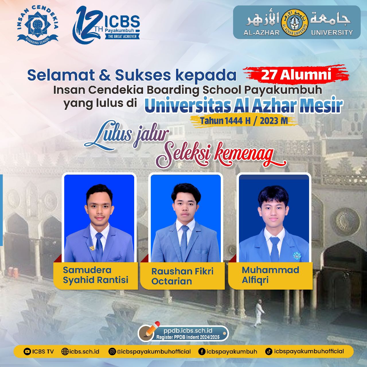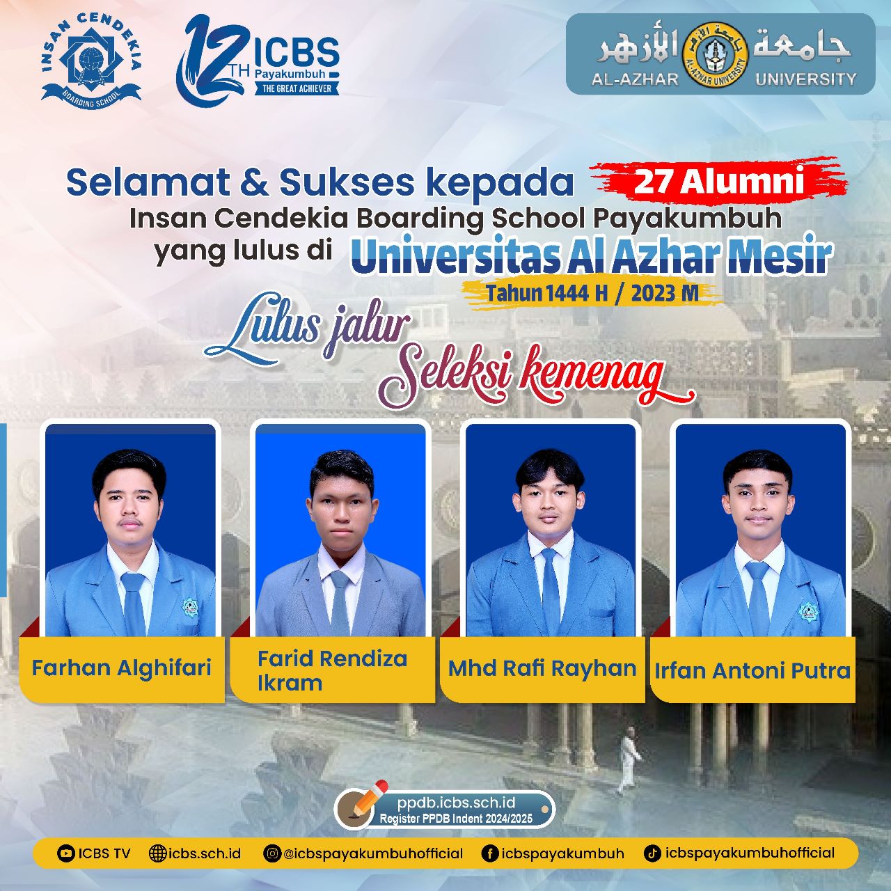 Keluarga besar ICBS (insan Cendekia Boarding School) mengucapkan selamat kepada para santri yang telah lulus seleksi dan berkesempatan untuk melanjutkan studi ke Universitas Al-Azhar Kairo, Mesir melalui jalur Kementerian Agama. Ini adalah kesempatan yang luar biasa untuk menimba ilmu di salah satu universitas Islam terkemuka di dunia.