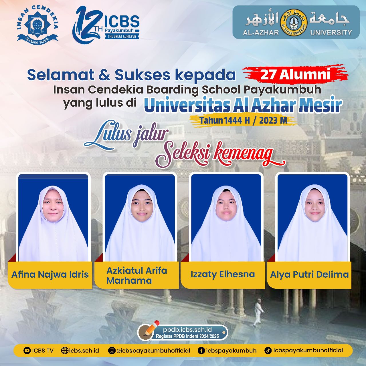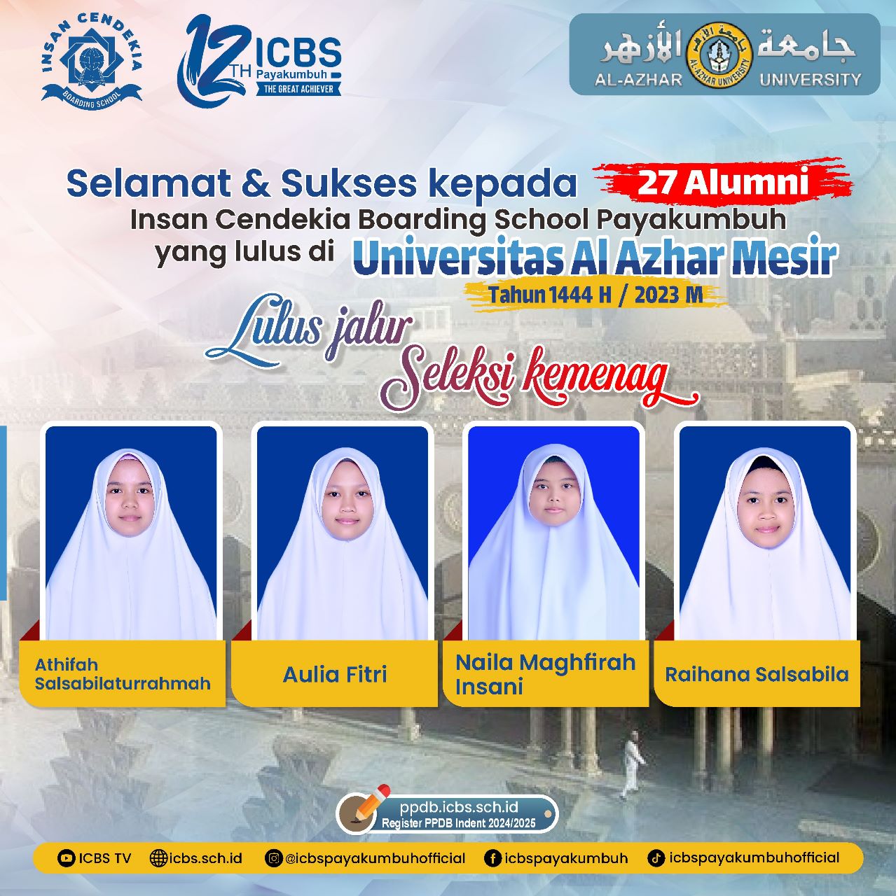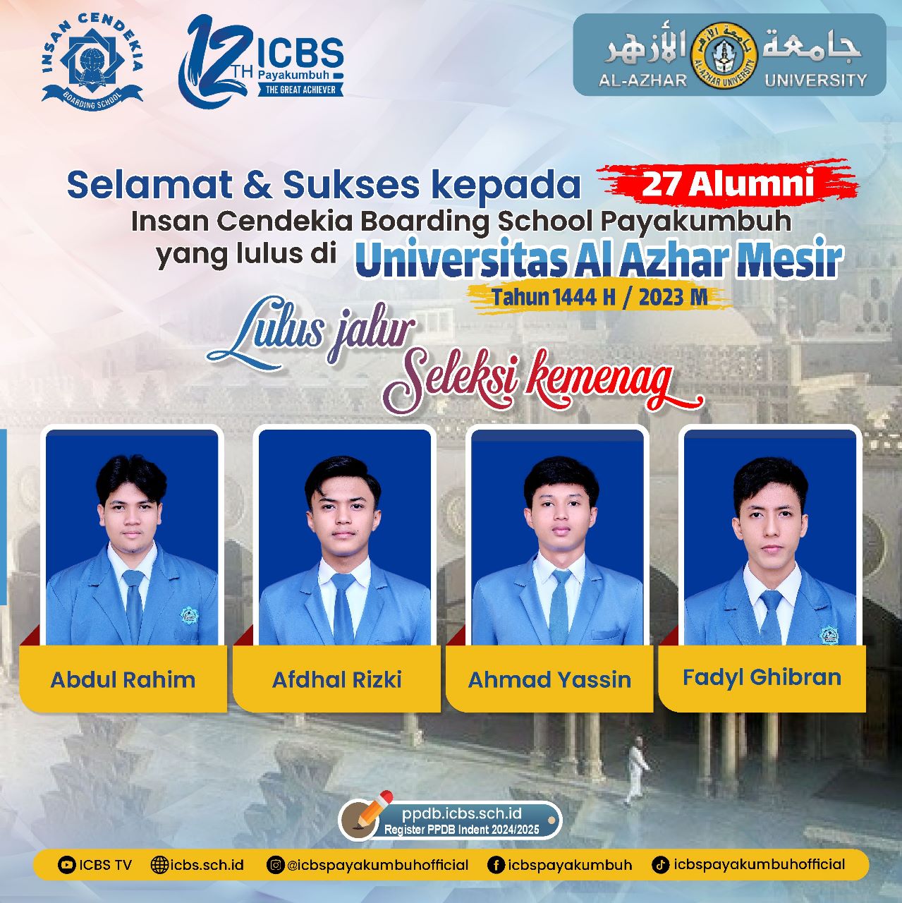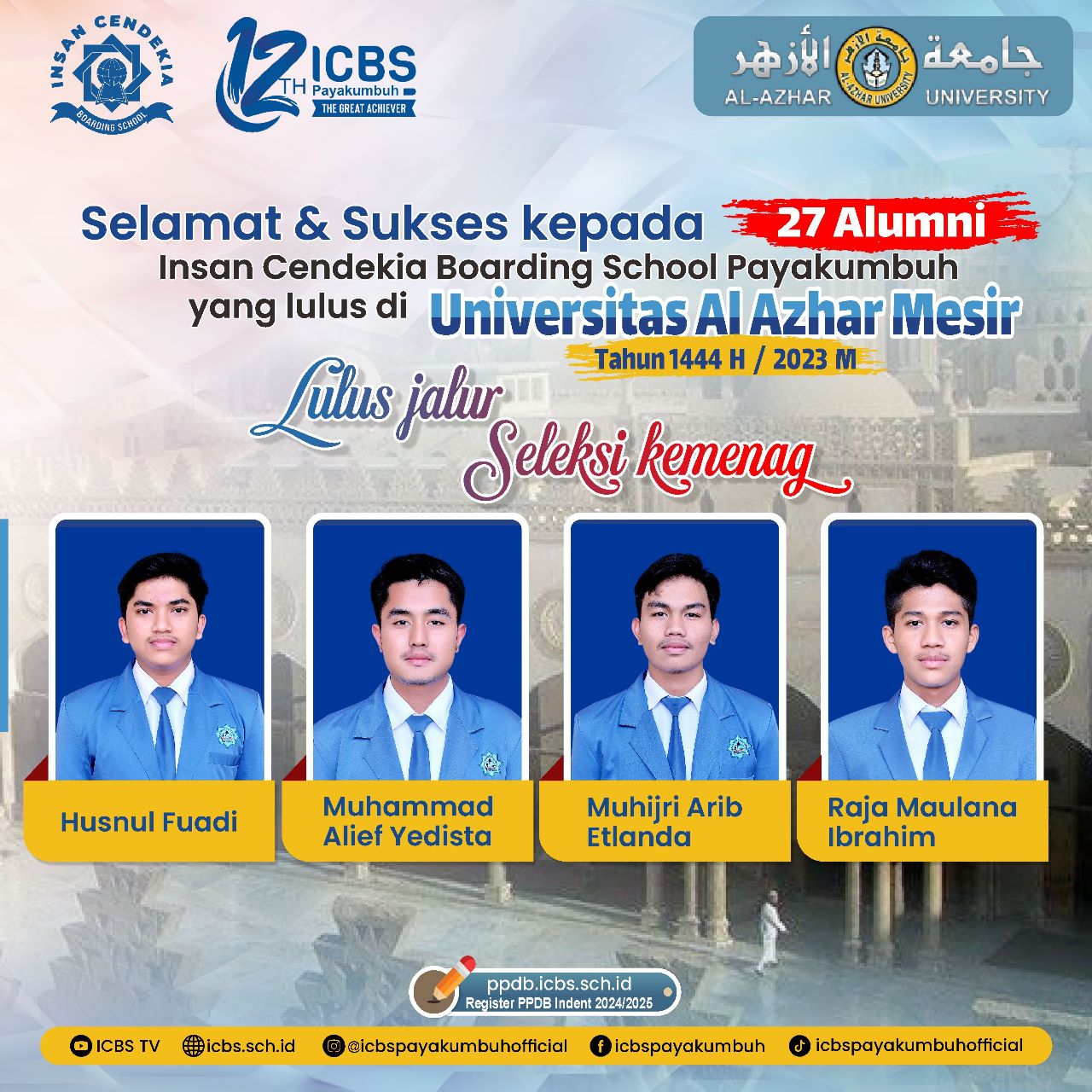 Keluarga besar ICBS (insan Cendekia Boarding School) mengucapkan selamat kepada para santri yang telah lulus seleksi dan berkesempatan untuk melanjutkan studi ke Universitas Al-Azhar Kairo, Mesir melalui jalur Kementerian Agama. Ini adalah kesempatan yang luar biasa untuk menimba ilmu di salah satu universitas Islam terkemuka di dunia.