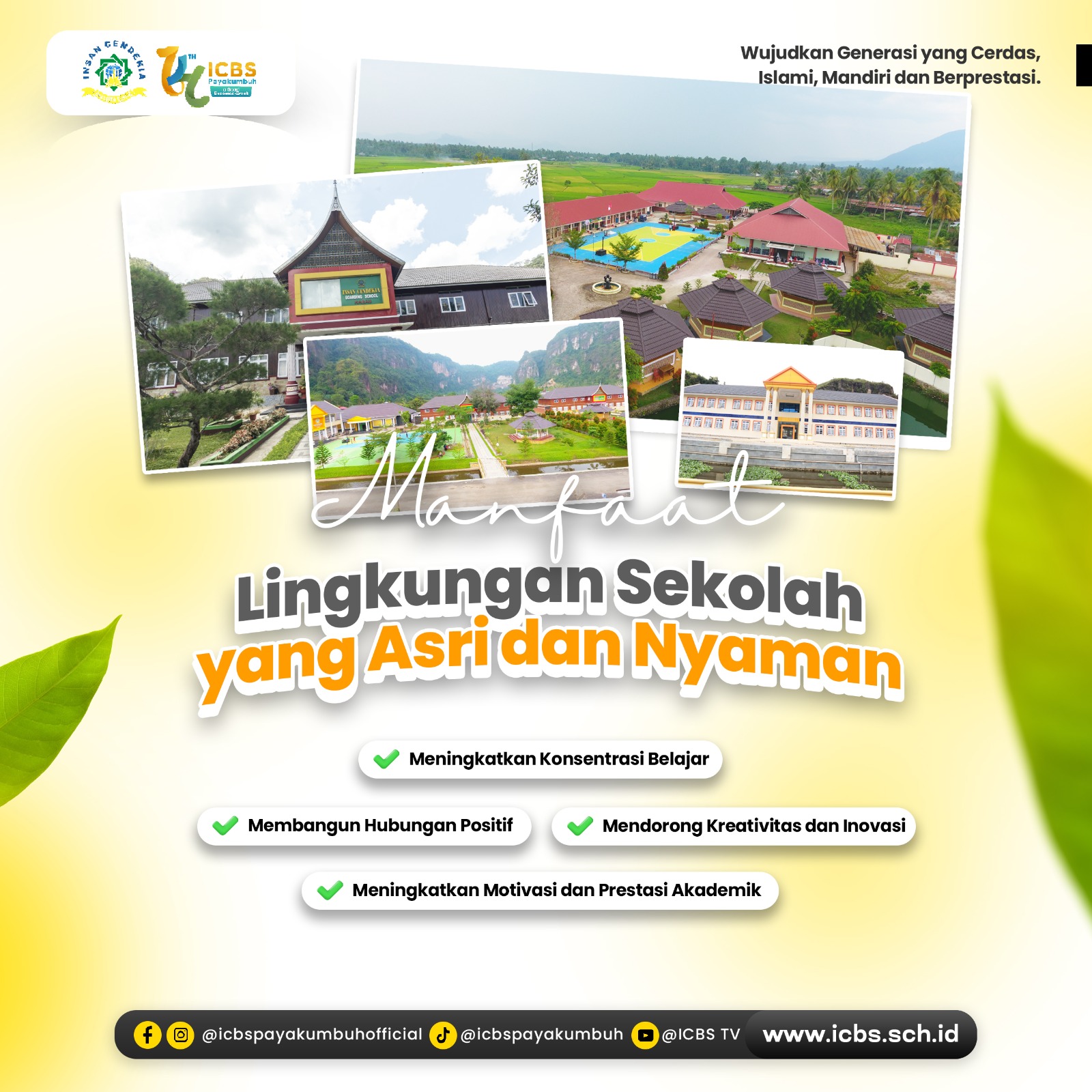 Tahukah kamu? Lingkungan sekolah punya peran besar dalam menciptakan generasi cerdas dan berkarakter. Di Insan Cendekia Boarding School (ICBS), kami menghadirkan suasana yang asri dan nyaman untuk menunjang kehidupan belajar santri. Yuk, simak manfaat lingkungan asri di ICBS:
