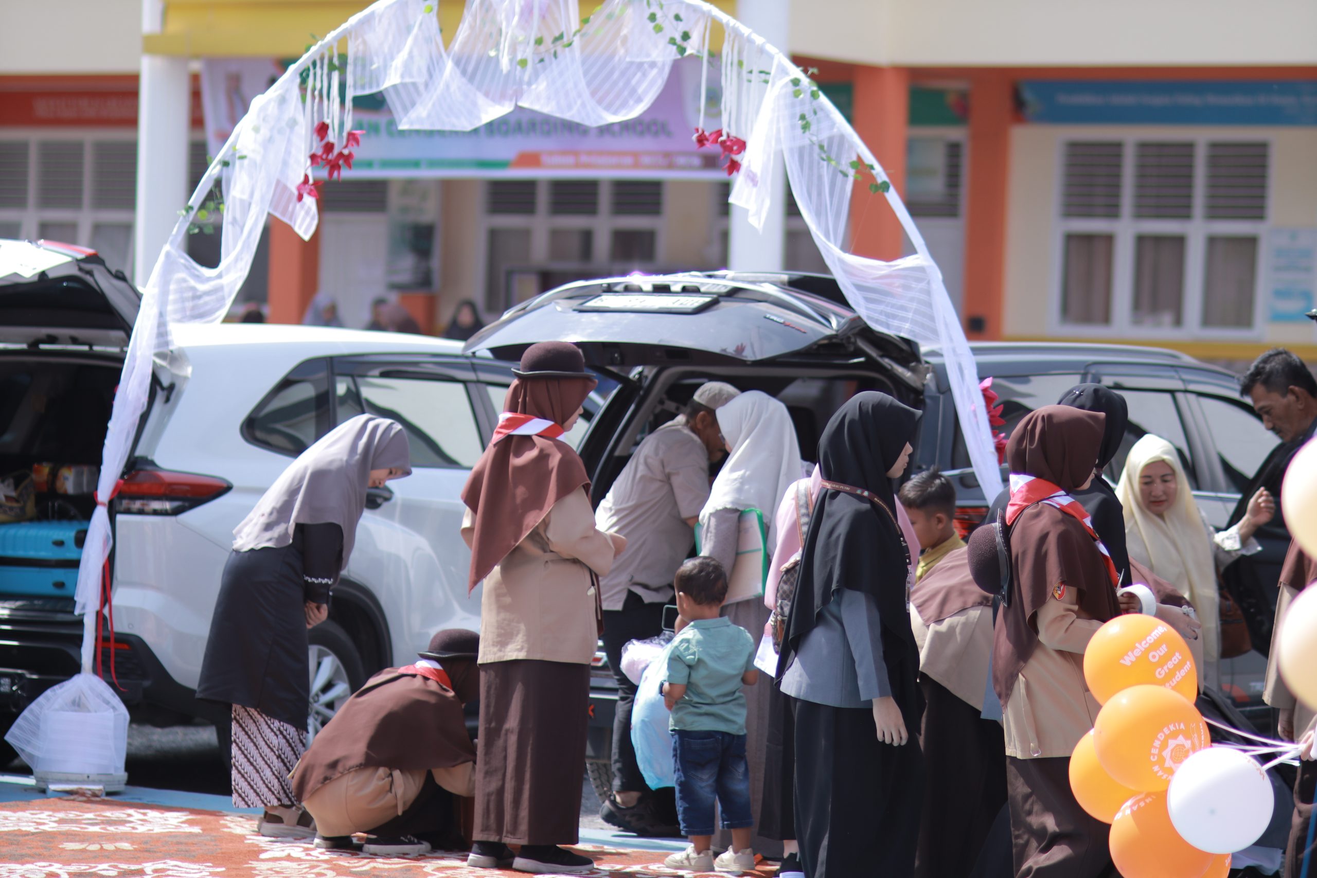 Para ustadzah dan kakak asrama menyambut hangat setiap santriwati yang datang. Alunan shalawat, bunga sambutan, dan banner besar bertuliskan “Selamat Datang Santri Putri Baru ICBS Harau 2025” memperindah suasana.