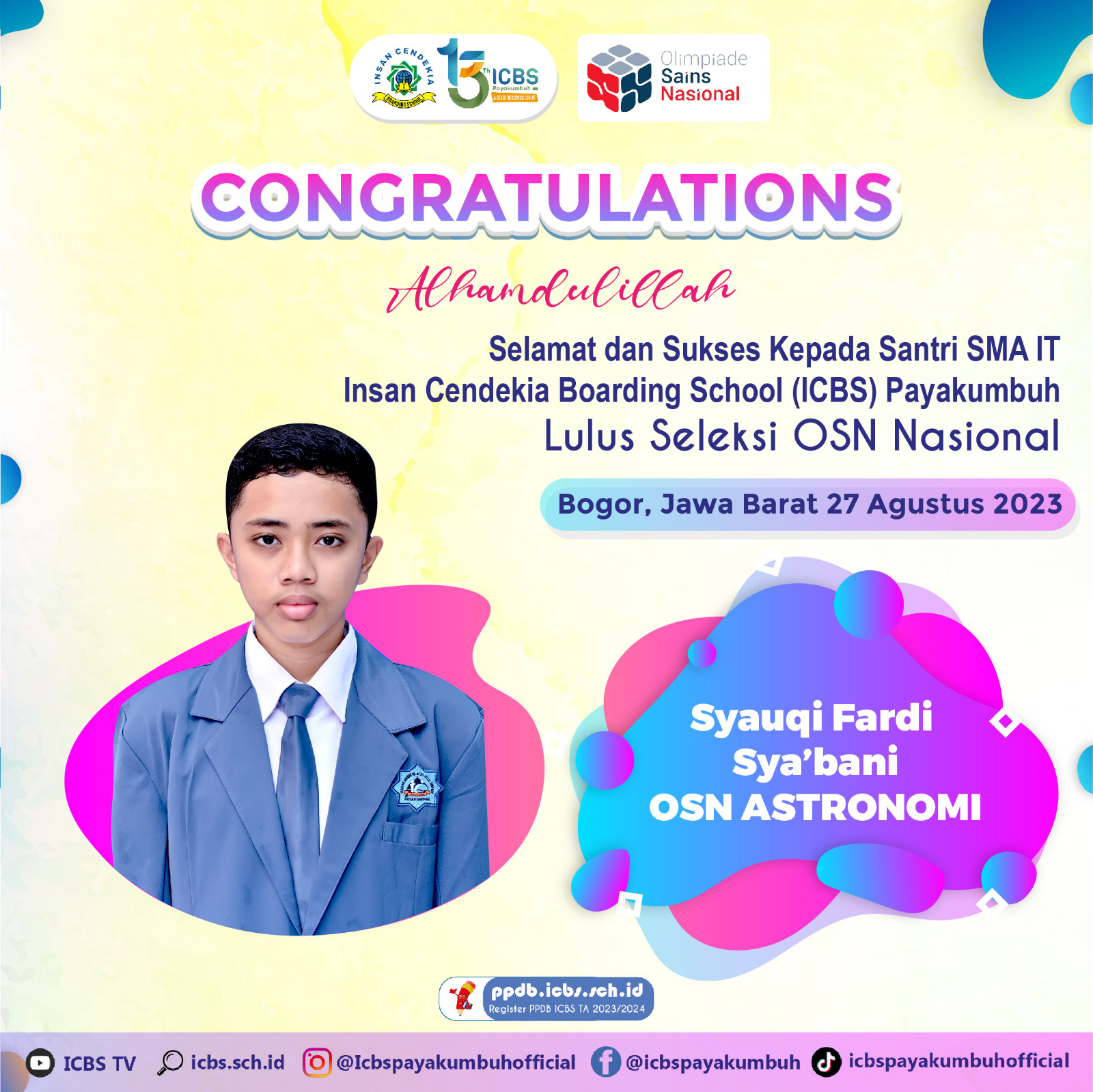 Semoga kedua siswa SMA IT ICBS dapat memberikan yang terbaik di ajang OSN tingkat nasional dan meraih prestasi yang membanggakan untuk sekolah dan juga untuk Indonesia.