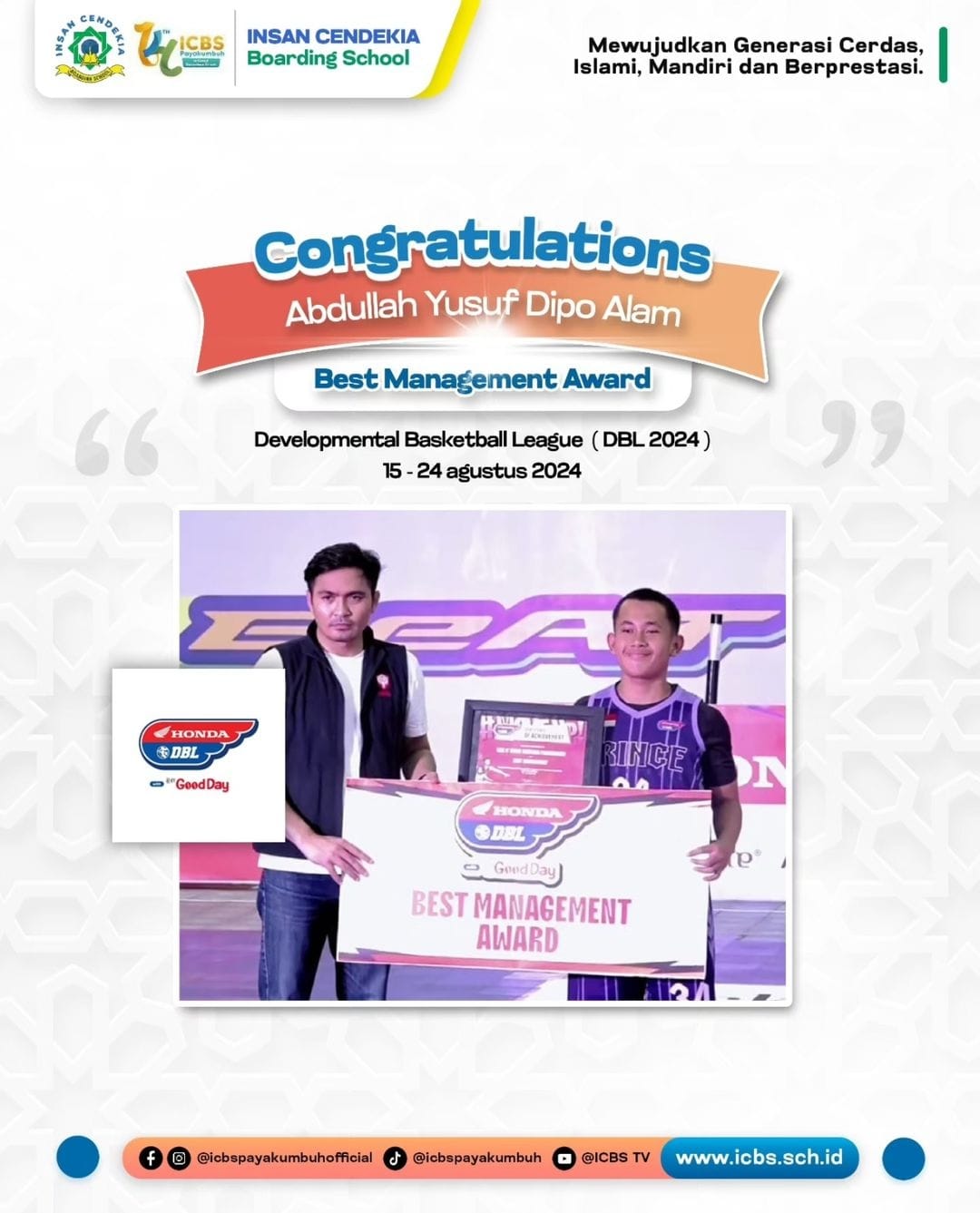 Selamat kepada Ananda Abdullah Yusuf Dipo. Santri Insan cendekia Boarding School yang mengukir prestasi gemilang dengan meraih Best Managemant Awar di ajang DBL 2024 yang berlangsung pada 15-24 Agustus 2024. Prestasi ini bukan hanya sebuah kemenangan tetapi tentang dedikasi, kerja keras, dan semangat juang yang tinggi. Abdullah telah membuktikan bahwa dengan manjemen yang yang baik, setiap tantangan dapat dihadapi dengan tenang dan terencana.