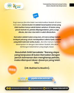 “Barang siapa yang berpuasa di bulan Ramadan dengan penuh keimanan dan mengharap pahala, maka diampuni dosa-dosanya yang telah lalu.” (HR. Bukhari & Muslim)