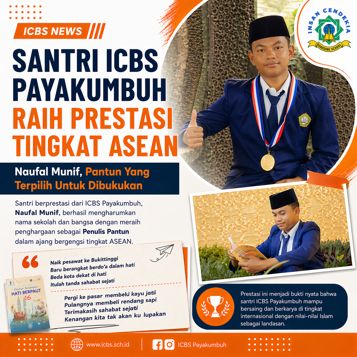 Payakumbuh — Prestasi membanggakan kembali ditorehkan oleh santri Insan Cendekia Boarding School (ICBS) Payakumbuh. Salah satu santri SMP IT ICBS, Naufal Munif, berhasil mengukir capaian gemilang sebagai Penulis Pantun Terpilih Se-ASEAN dalam ajang yang diselenggarakan oleh SIP Publishing bekerja sama dengan Penyala Literasi Sumatera Barat. Karya pantunnya yang berjudul “Pantun Serumpun Hati Berpaut” berhasil mengantarkannya bersaing dan diakui di tingkat internasional.