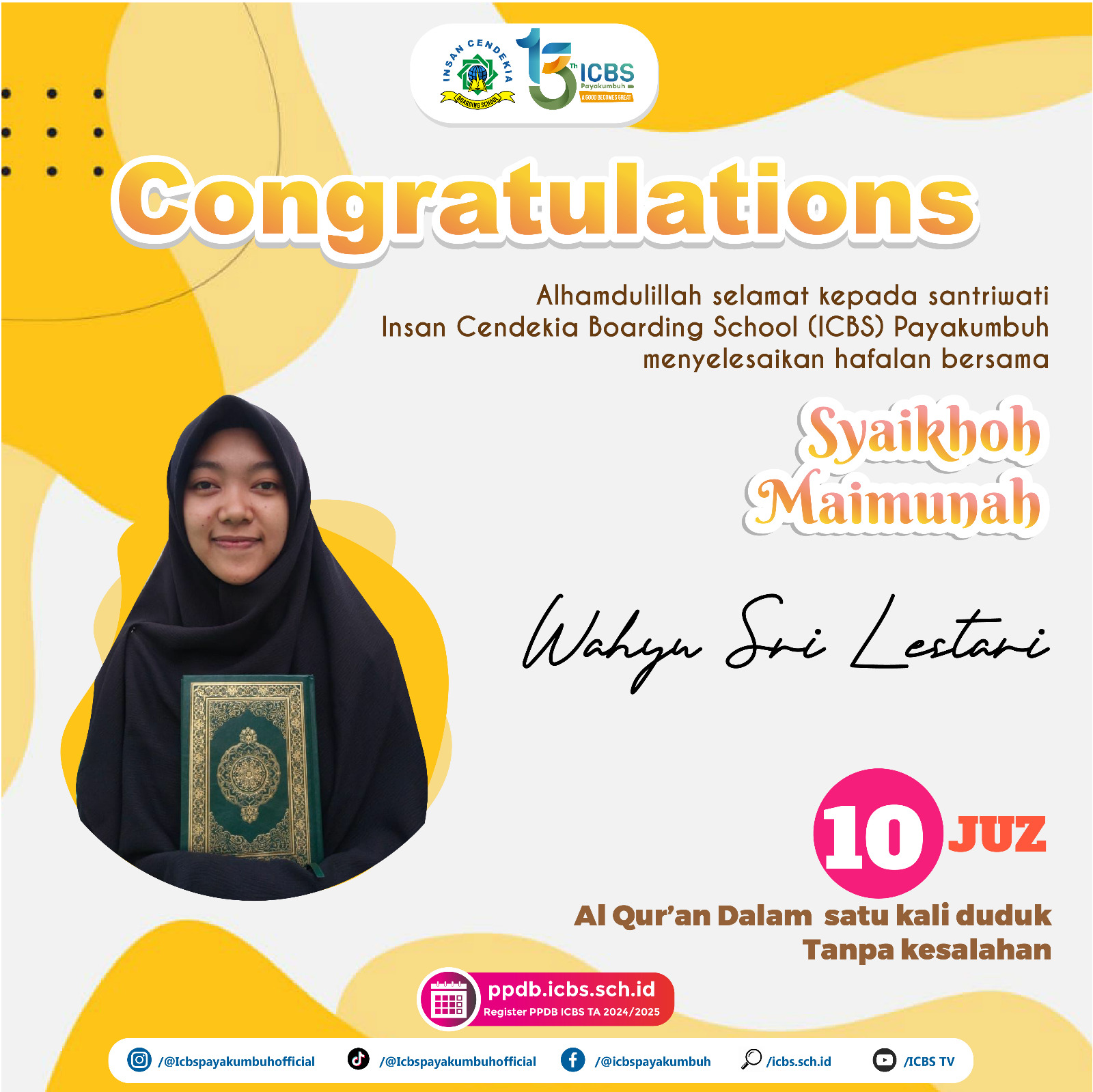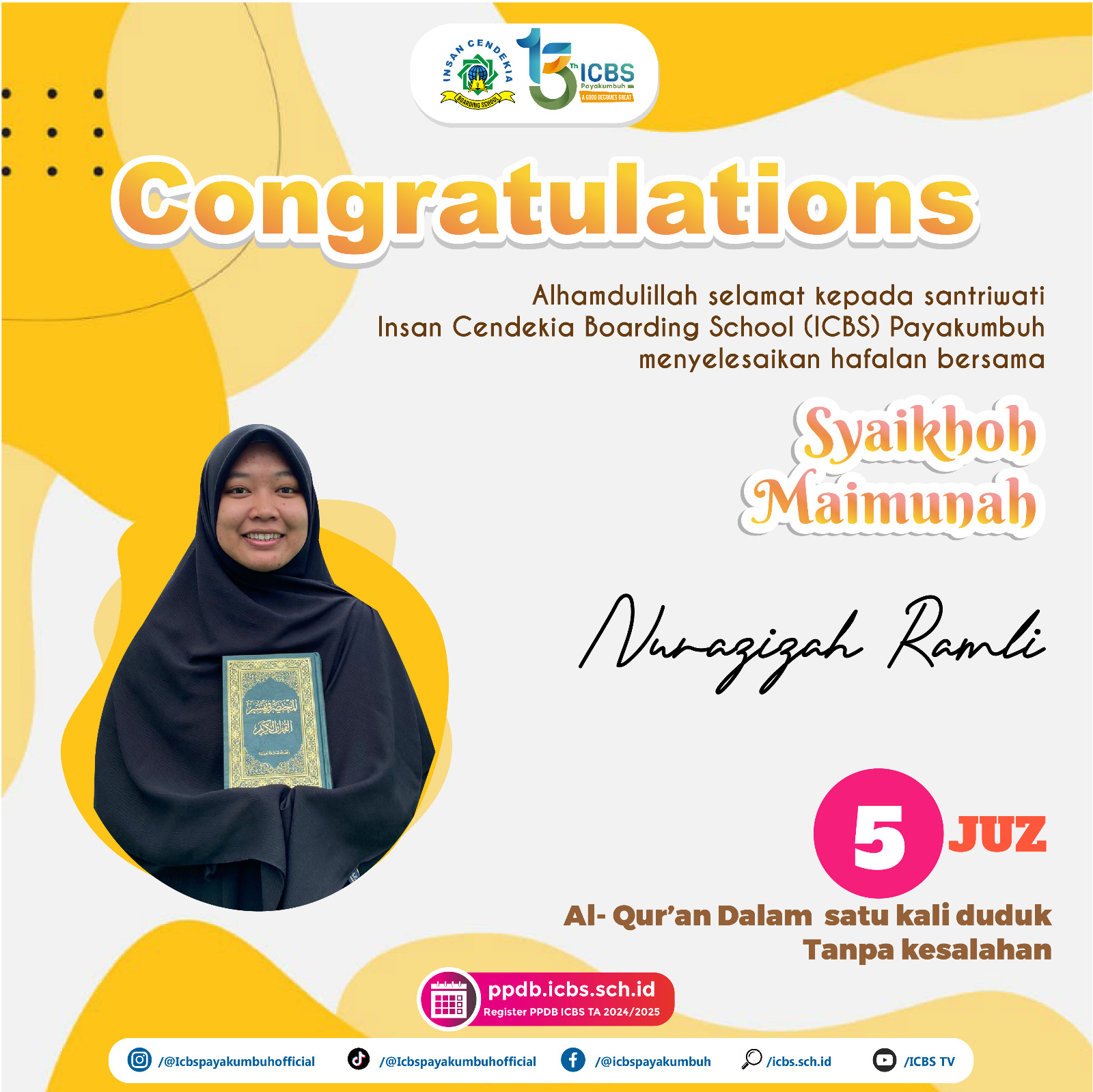Santri Insan Cendekia Boarding School ( ICBS) Payakumbuh telah menyelesaikan hafalan bersama Syaikhoh Maimunah dalam satu kali duduk tanpa kesalahan