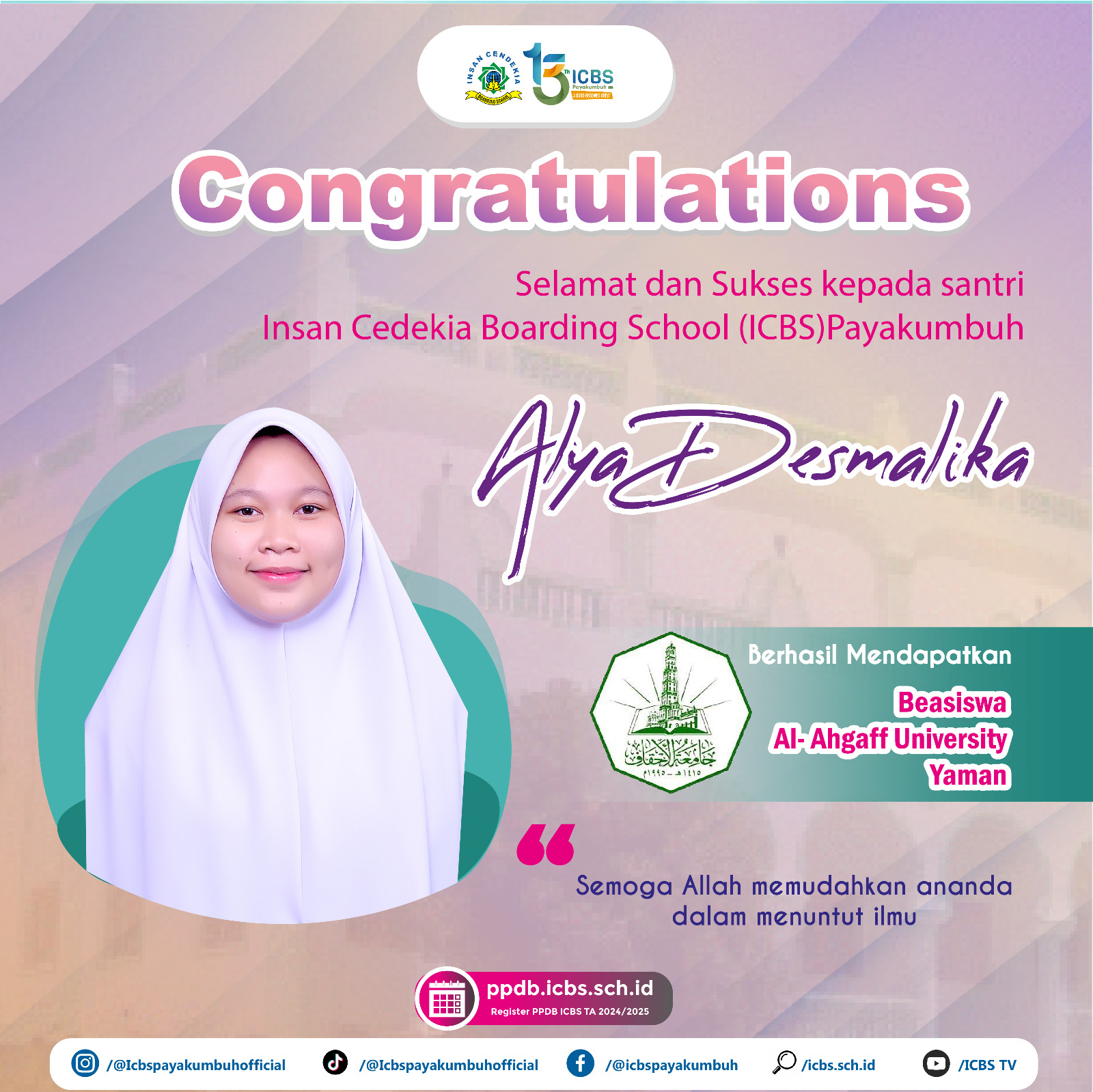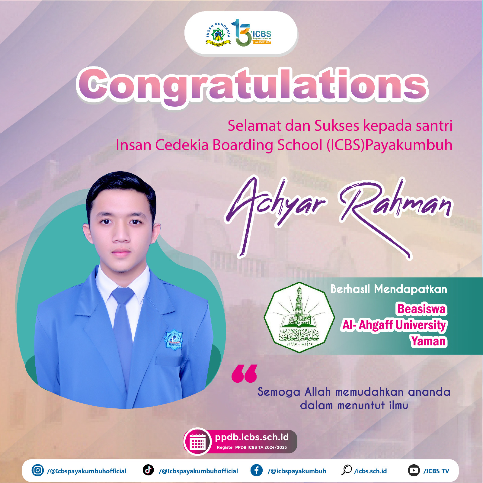 Berhasil lulus beasiswa ke Al-Ahgaff University Yaman, Tahun Ajaran 2023/2024.