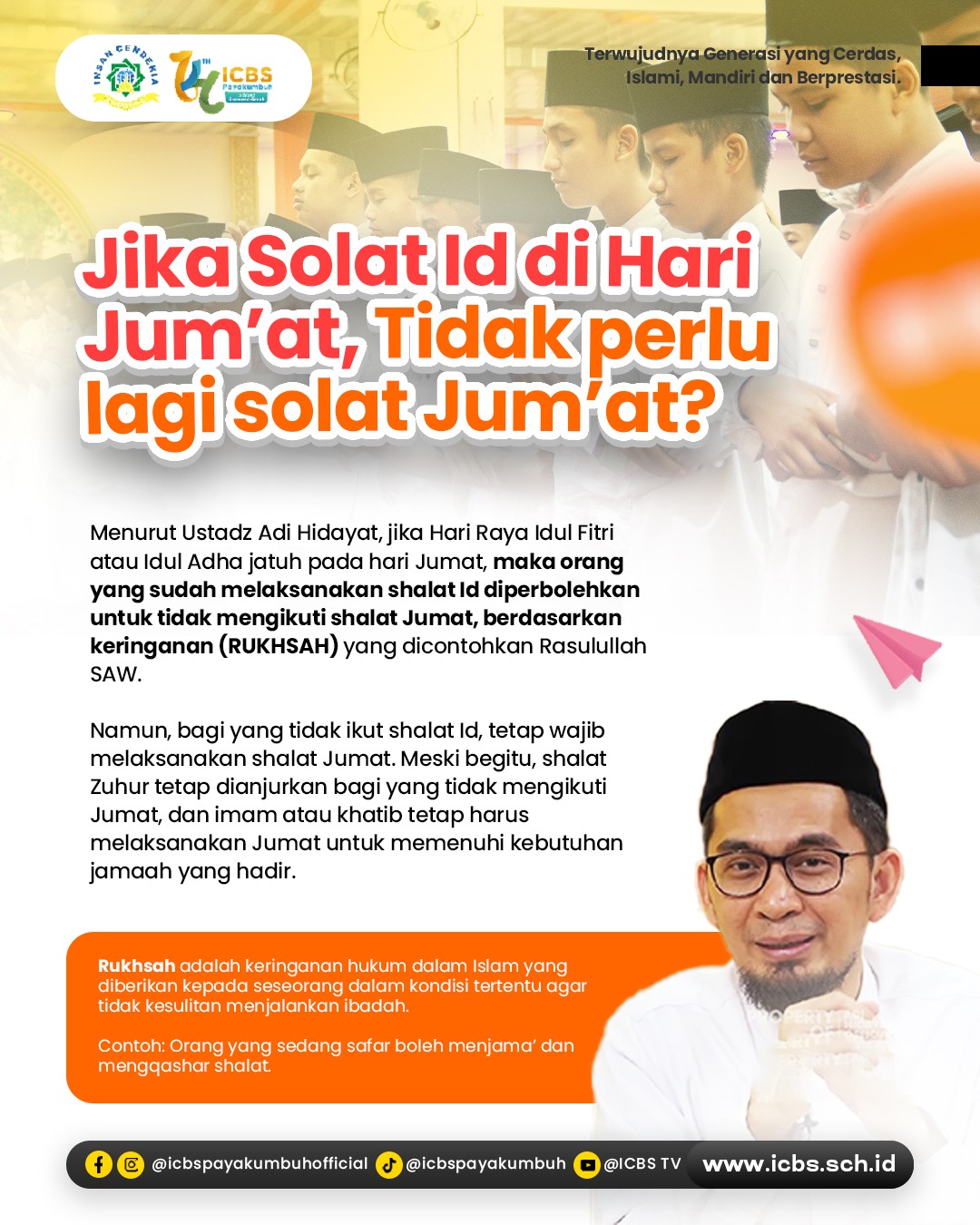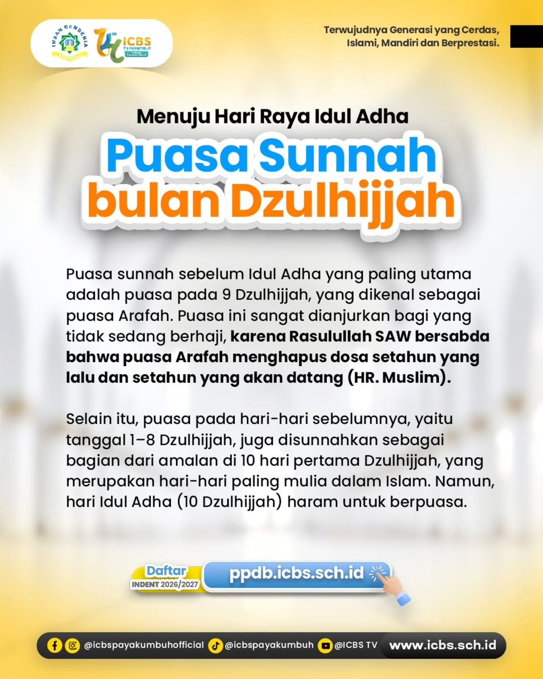 ICBS Menuju Hari Raya Idul Adha Tahukah kamu? 10 hari pertama bulan Dzulhijjah adalah hari-hari paling mulia dalam Islam! Yuk maksimalkan dengan puasa sunnah, terutama: ️ 1–8 Dzulhijjah: Puasa sunnah …