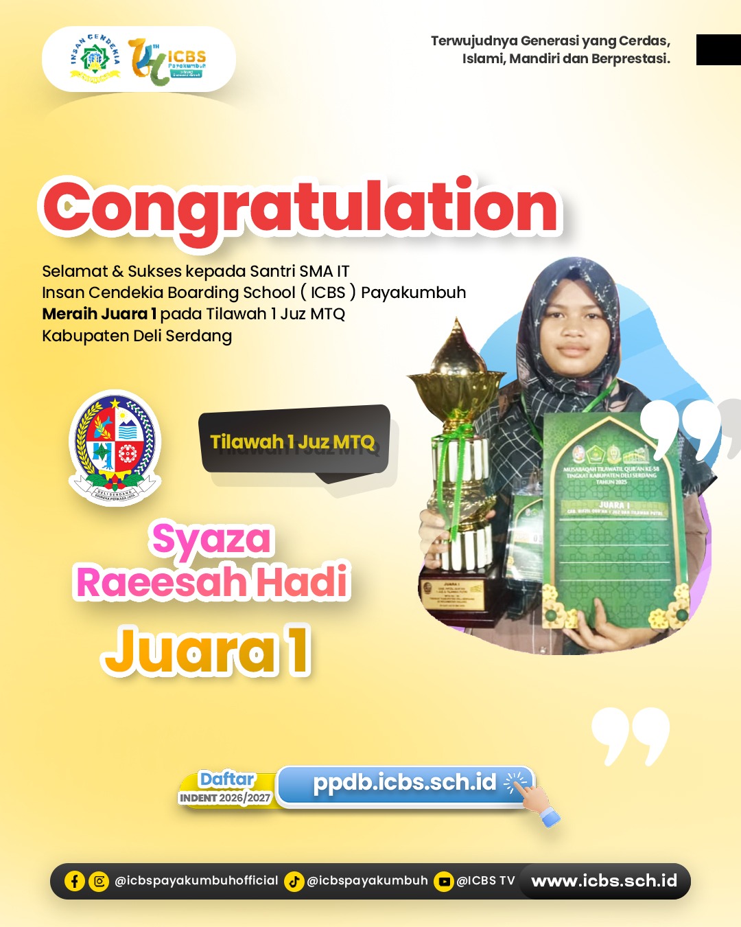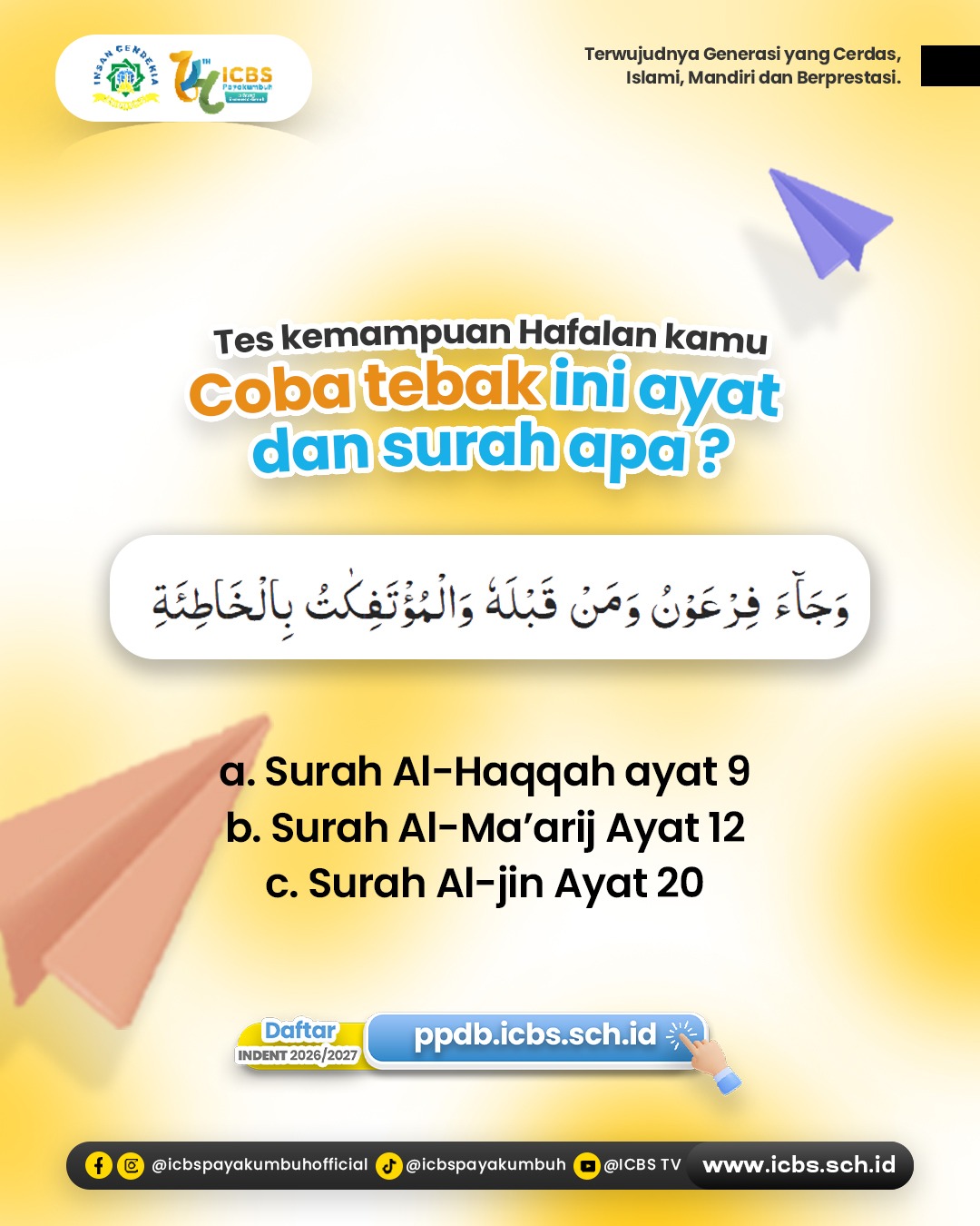 Kalimat berikut belum selesai: “Santri ICBS itu bukan hanya cerdas, tapi juga…” Yuk, lanjutkan kalimat ini versi kamu di kolom komentar! Tunjukkan seberapa kreatif kamu dalam menggambarkan sosok santri kebanggaan …