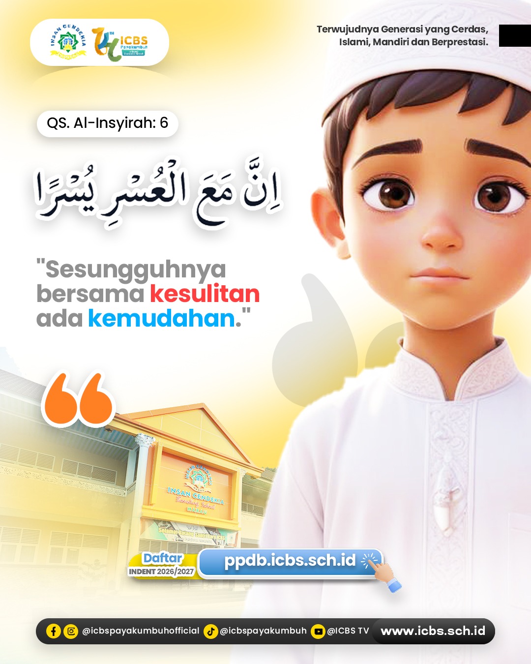 “Sesungguhnya bersama kesulitan ada kemudahan.” (QS. Al-Insyirah: 6) Ayat ini menjadi pengingat lembut dari Allah ﷻ bahwa setiap kesulitan pasti diiringi dengan kemudahan. Untuk para santri ICBS dan semua pejuang …