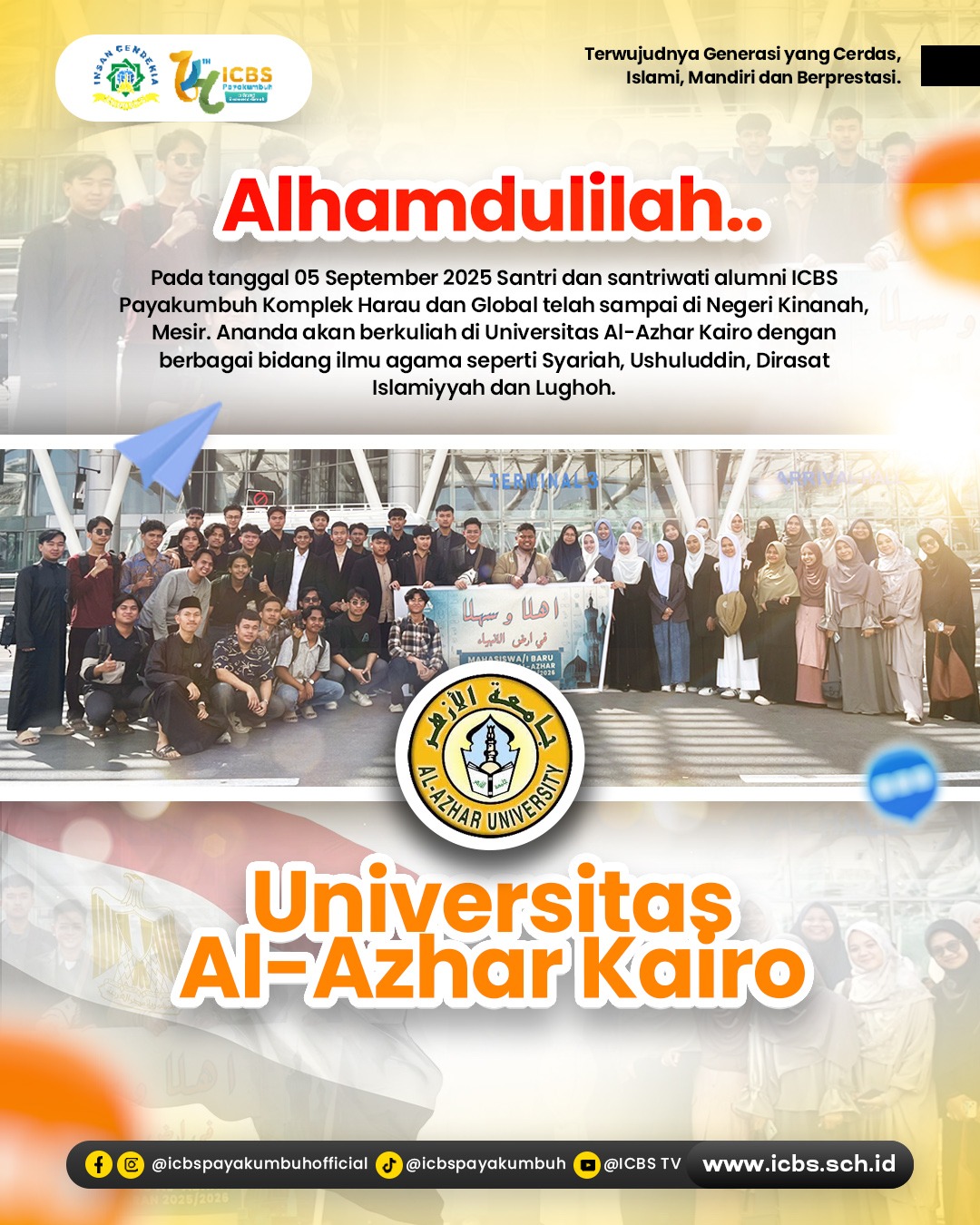 Pada tanggal 05 September 2025, santri dan santriwati alumni ICBS Payakumbuh Komplek Harau dan Global telah sampai di Negeri Kinanah, Mesir . Ananda akan melanjutkan studi di Universitas Al-Azhar Kairo, …