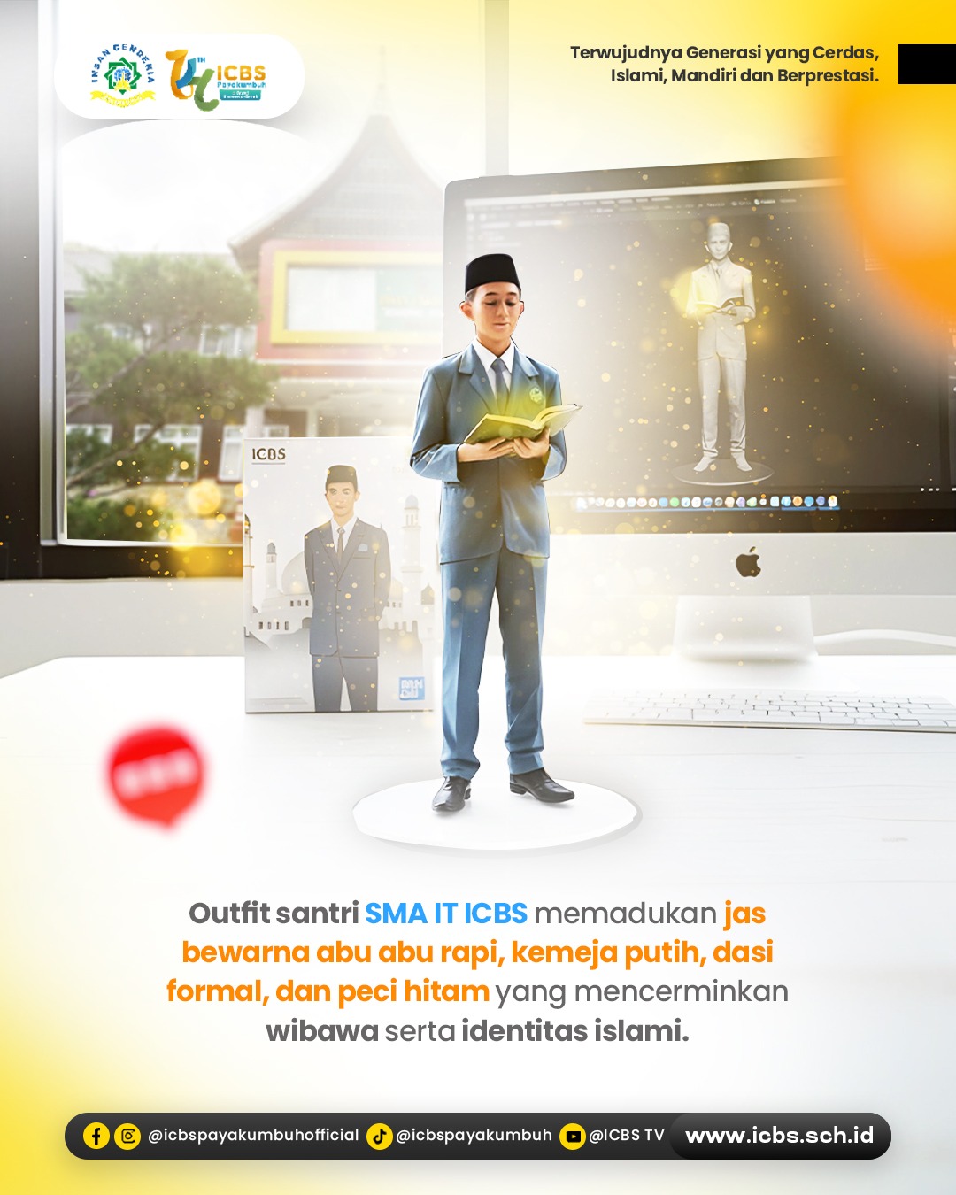 Outfit santri SMA IT ICBS memadukan: Jas abu-abu yang rapi Kemeja putih bersih Dasi formal elegan Peci hitam yang khas Perpaduan ini bukan sekadar pakaian, tapi simbol wibawa, kerapian, dan …