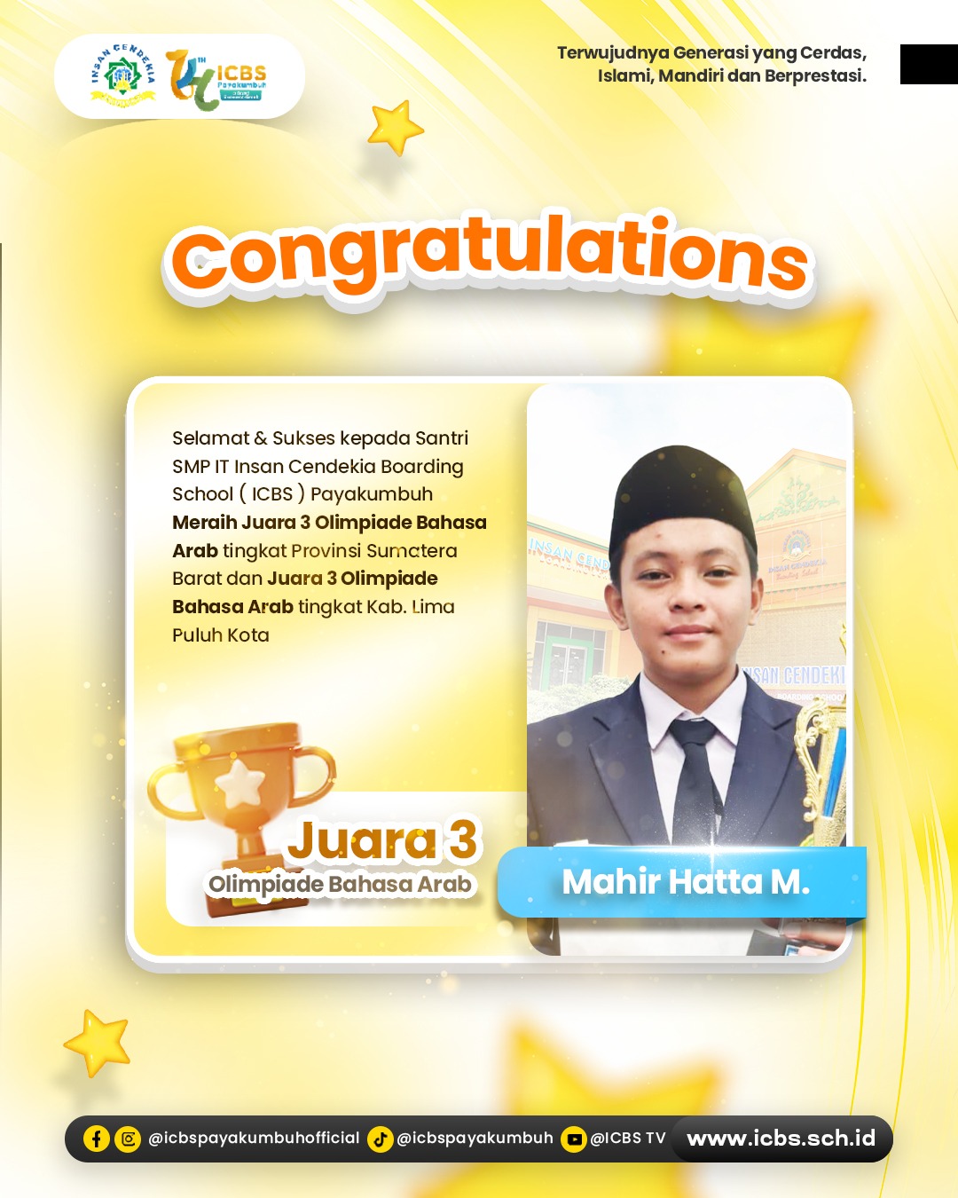 Payakumbuh, Sumatera Barat – Prestasi gemilang kembali ditorehkan oleh santri Islamic Center Boarding School (ICBS) Payakumbuh). Kali ini, giliran Mahir Hatta Mahadana yang berhasil mengukir namanya dalam ajang Olimpiade Bahasa …