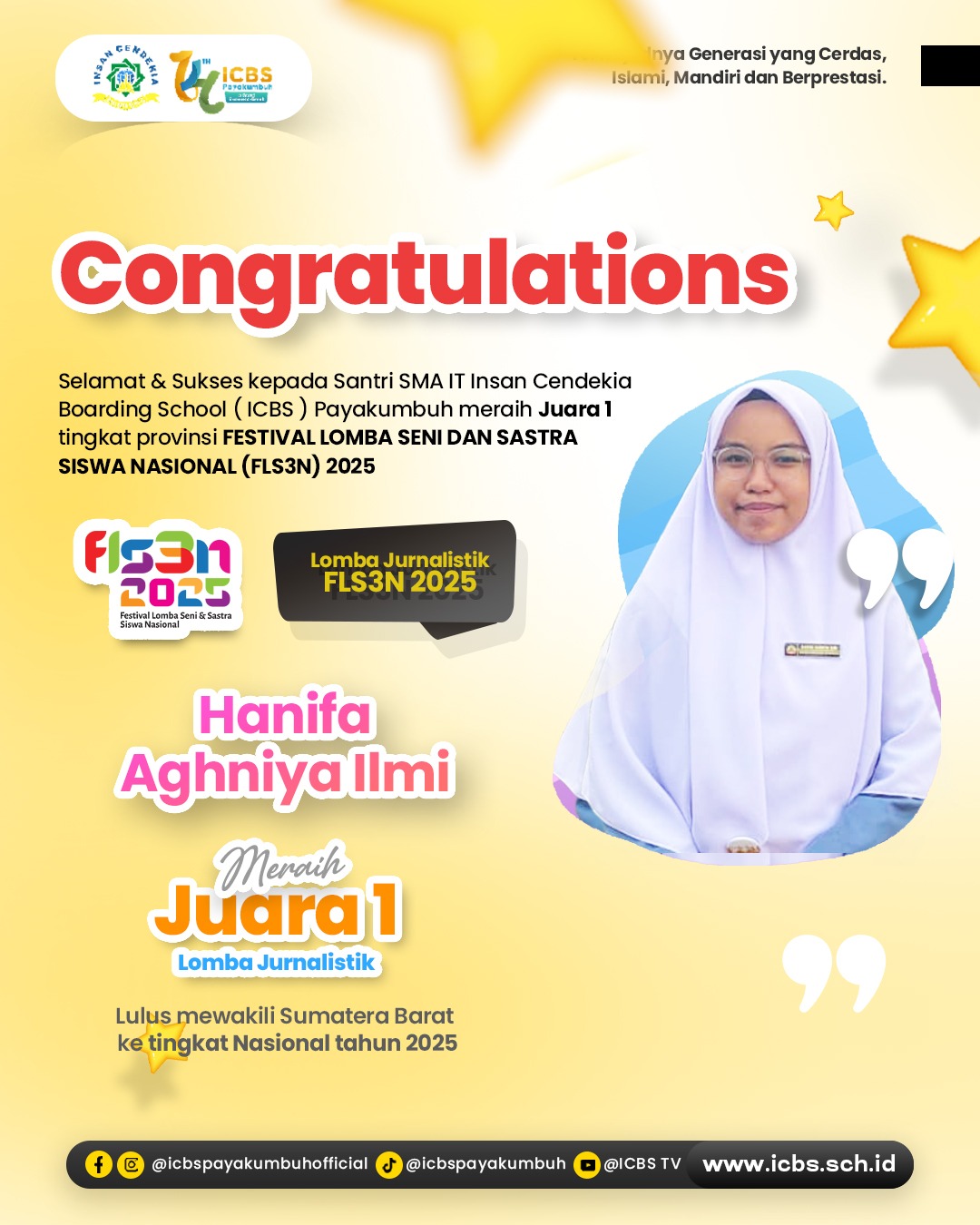 Alhamdulillah, kabar membanggakan datang dari santriwati kita, Hanifa Aghniya Ilmi Dalam ajang Festival Lomba Seni dan Sastra Siswa Nasional (FLS3N) 2025 yang diadakan oleh Puspresnas: Cabang lomba: Jurnalistik Juara 1 …