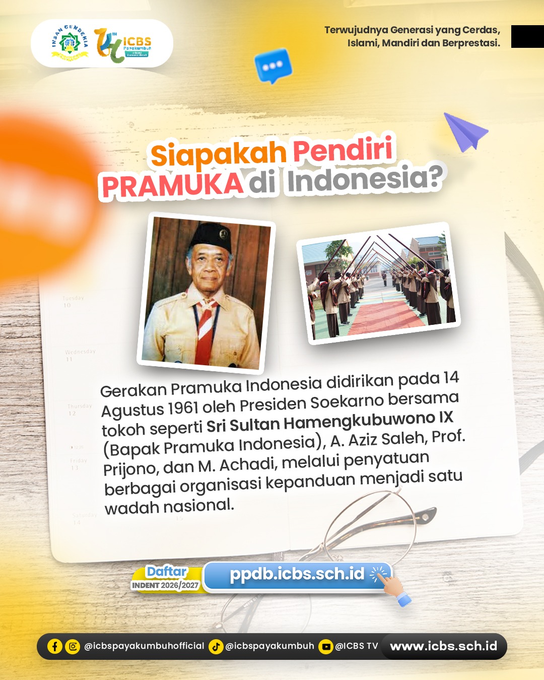 Gerakan Pramuka Indonesia resmi didirikan pada 14 Agustus 1961 oleh Presiden Soekarno, bersama para tokoh nasional: Sri Sultan Hamengkubuwono IX – Bapak Pramuka Indonesia A. Aziz Saleh Prof. Prijono M. …