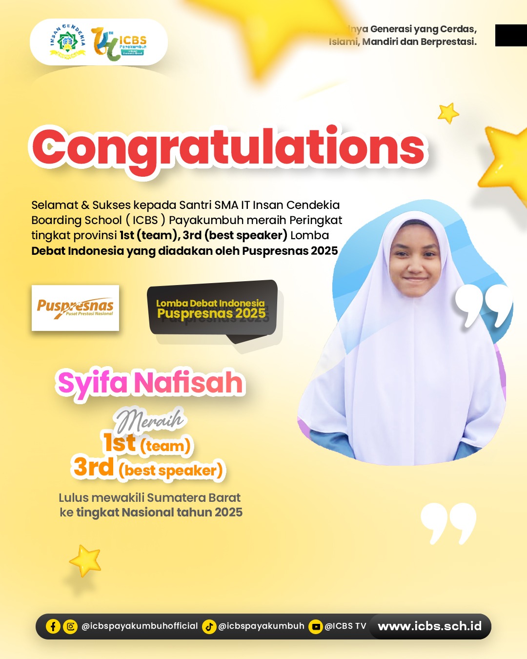 Prestasi Membanggakan! Alhamdulillah, kabar gembira datang dari santriwati kita, Syifa Nafisah Dalam ajang Lomba Debat Indonesia yang diadakan oleh Puspresnas 2025, pada cabang NSDC (National Schools Debating Championship): Juara 1 …