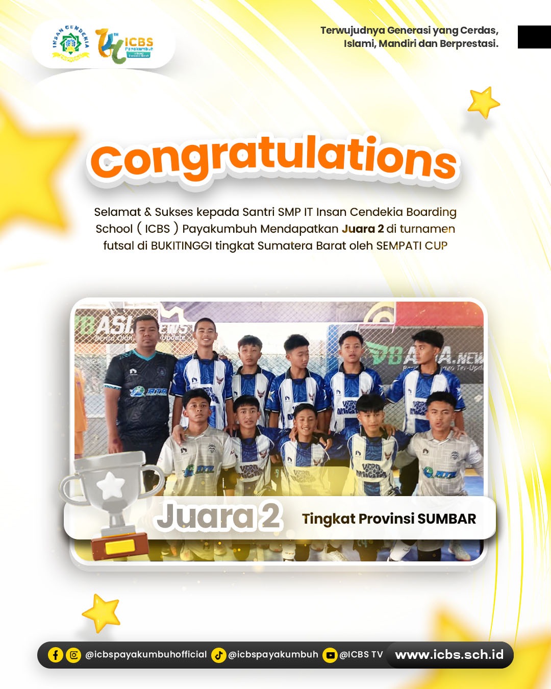 Alhamdulillah, prestasi membanggakan kembali diraih oleh santri SMP IT Insan Cendekia Boarding School (ICBS) Payakumbuh dalam turnamen futsal tingkat Sumatera Barat pada ajang SEMPATI CUP di Bukittinggi. ✨ Tim ICH …
