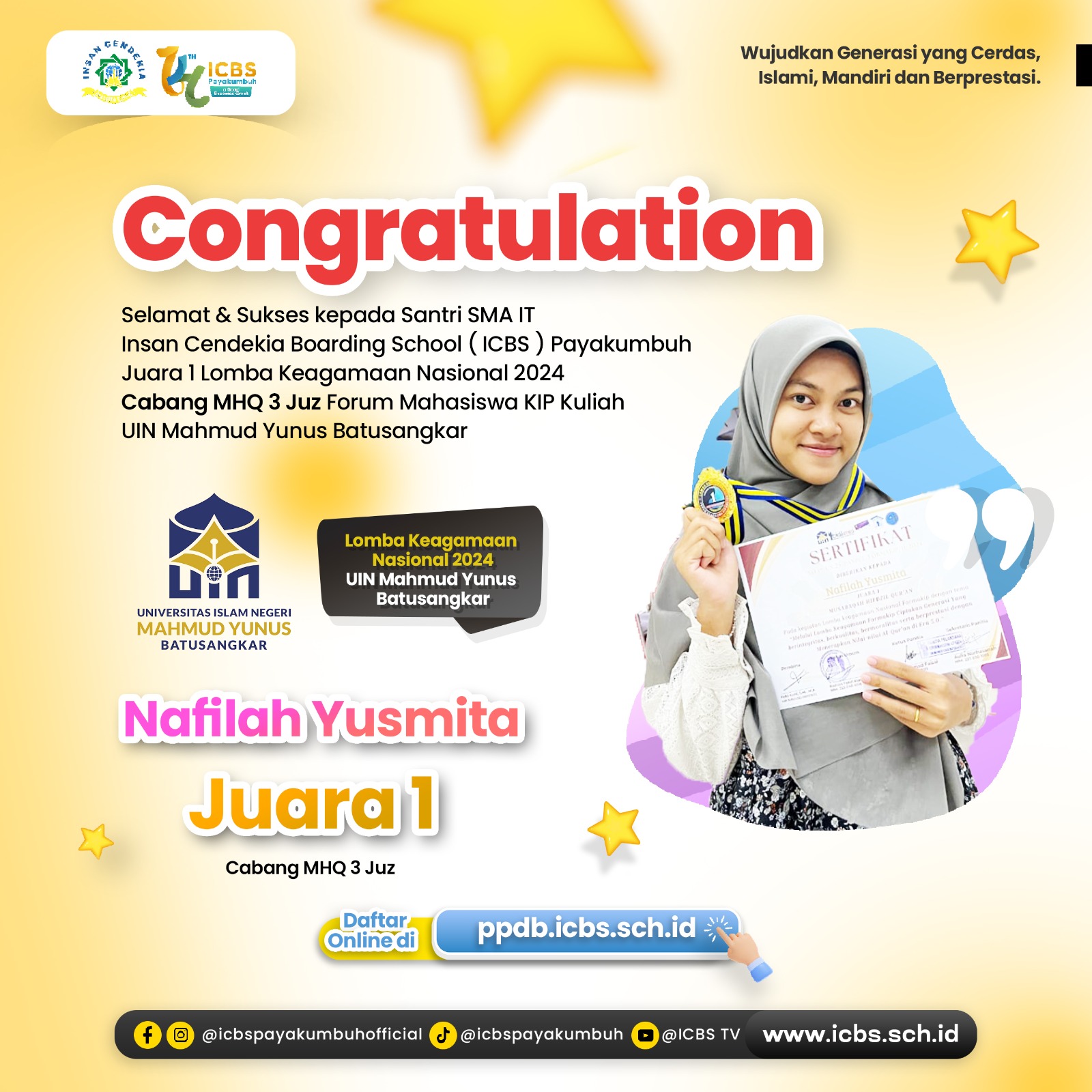 Selamat kepada Nafilah Yusmita, santri ICBS, yang telah meraih Juara 1 dalam Lomba Keagamaan Nasional 2024 cabang MHQ 3 Juz! ✨ Kompetisi ini diselenggarakan oleh Forum Mahasiswa KIP Kuliah UIN …