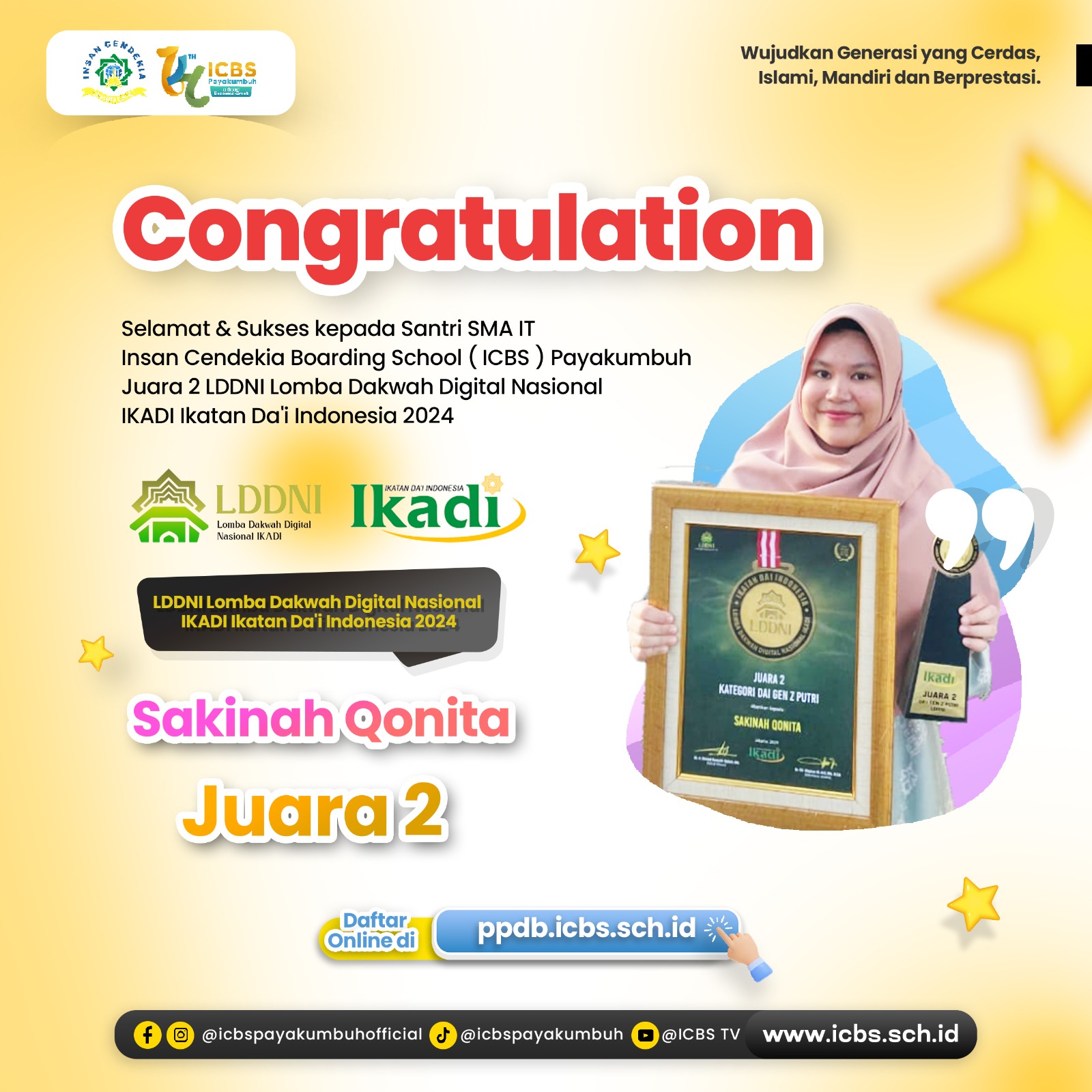 Selamat kepada Sakinah Qonita, santri ICBS yang berhasil meraih Juara 2 dalam Lomba Dakwah Digital Nasional (LDDNI) 2024 yang diselenggarakan oleh IKADI (Ikatan Da’i Indonesia)! ✨ Dengan kreativitas dan pesan …