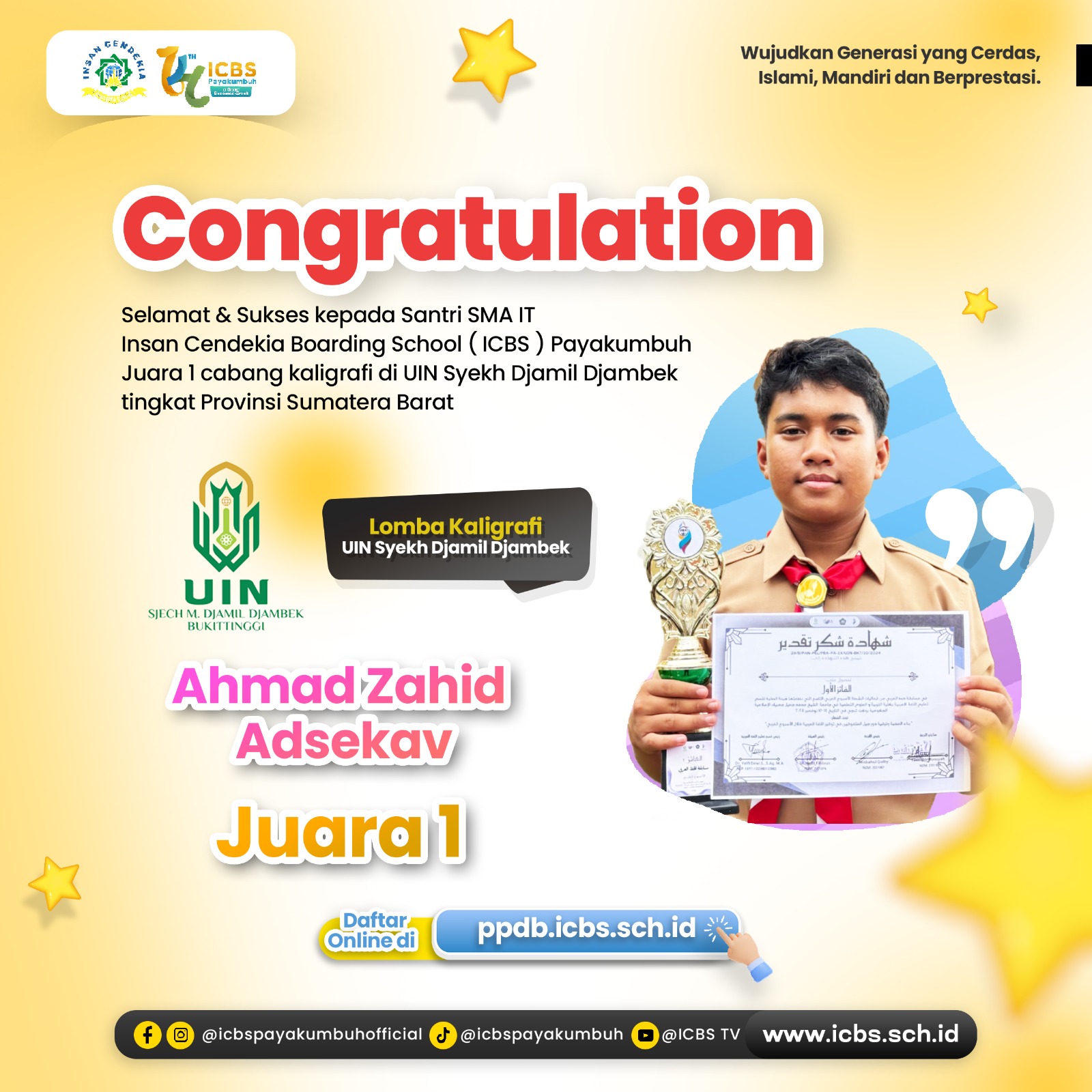 Alhamdulillah, selamat kepada Ahmad Zahid Adsekav, siswa kelas 10.1 ICBS, yang berhasil meraih Juara 1 dalam cabang Kaligrafi pada kompetisi yang diselenggarakan oleh UIN Syekh Djamil Djambek tingkat Provinsi Sumatera …