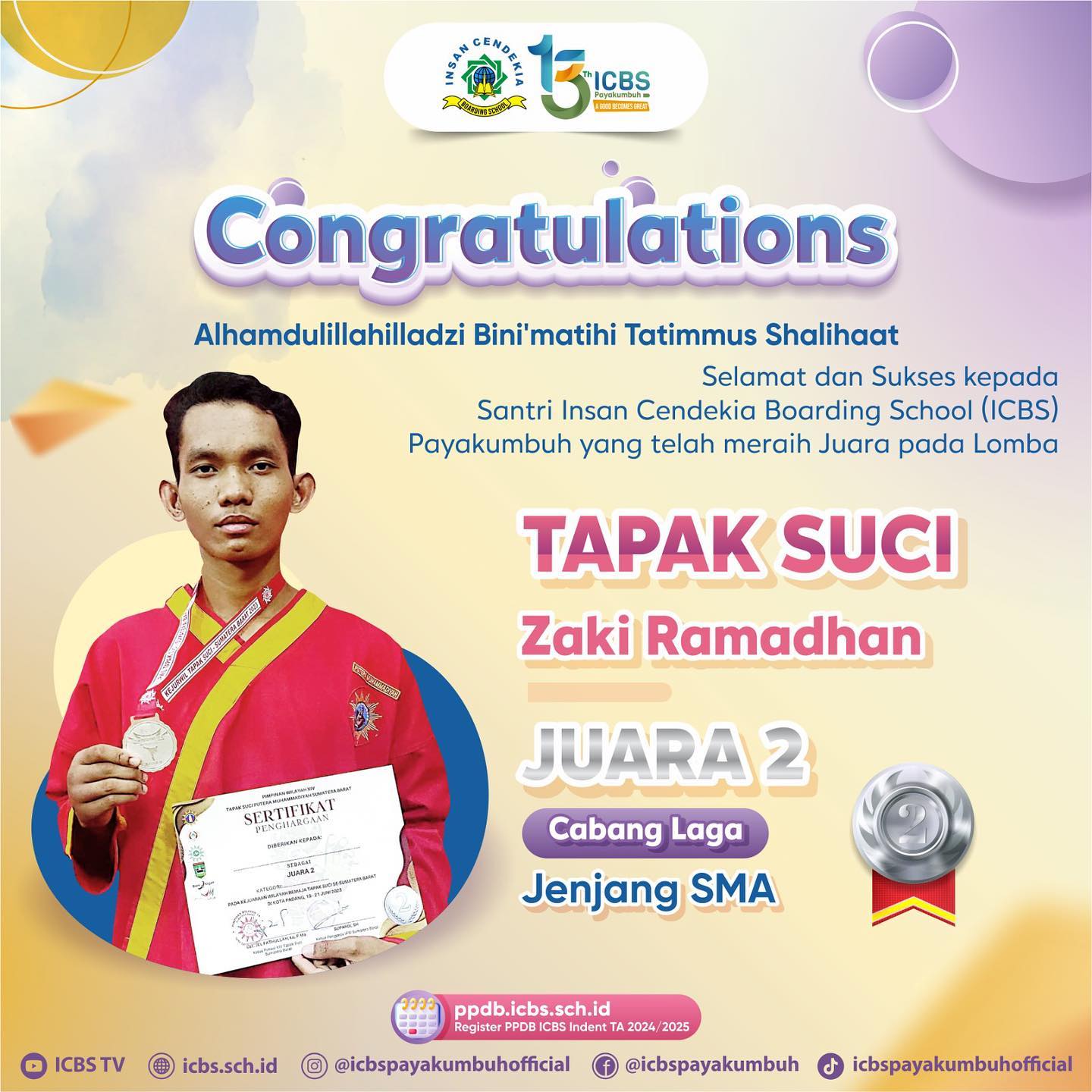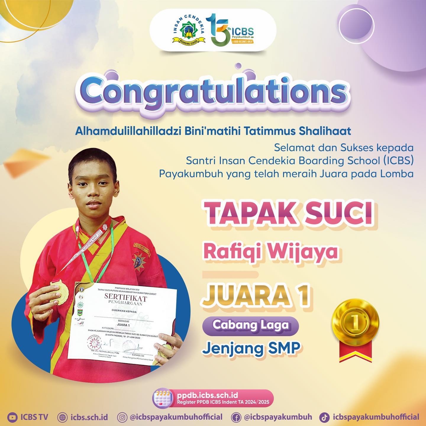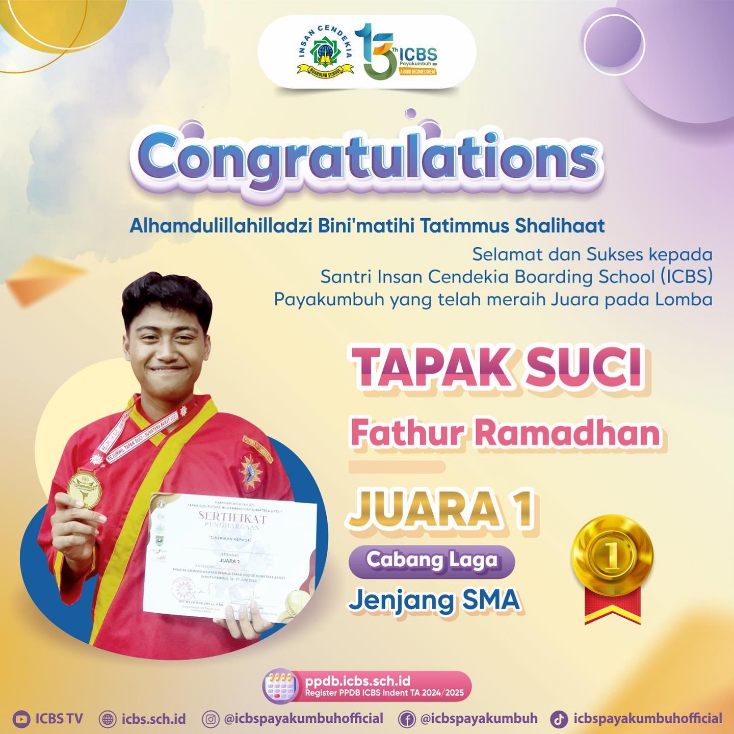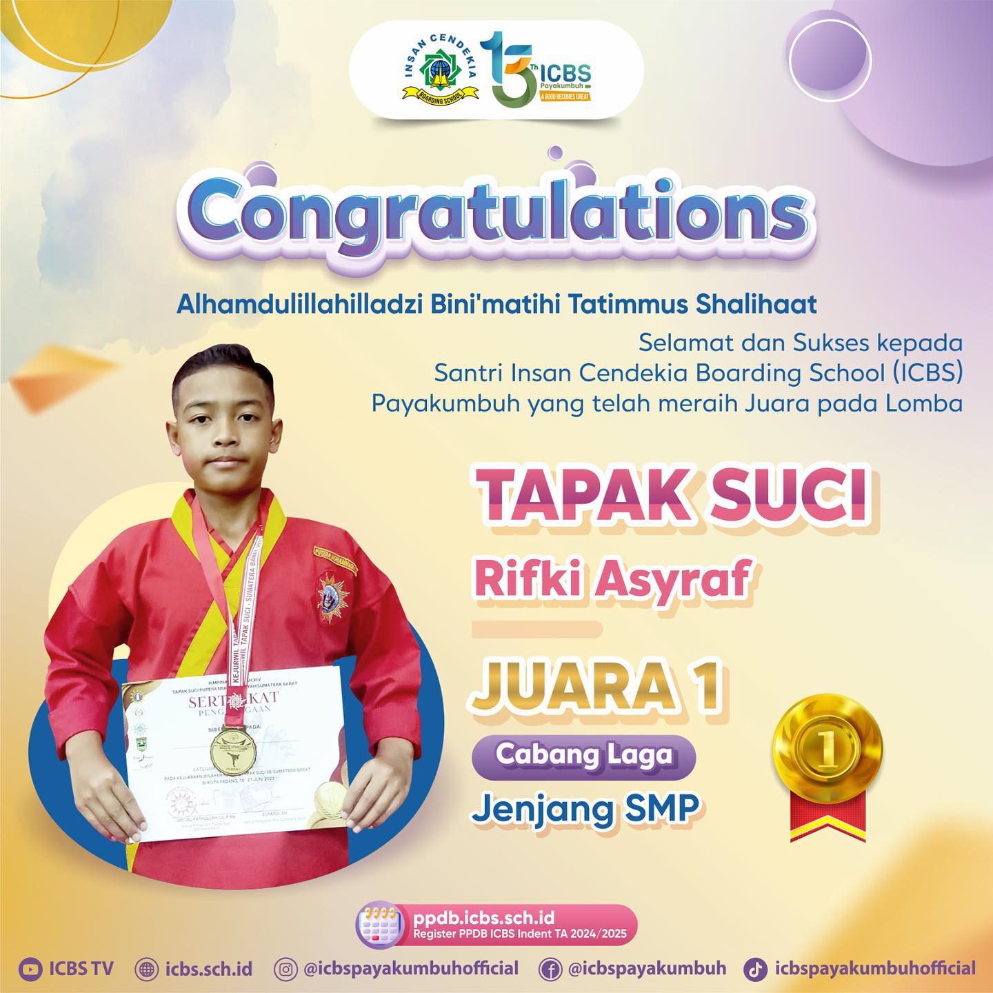 Selamat kepada seluruh santri ICBS yang telah berhasil meraih medali emas dalam lomba Tapak Suci Provinsi Sumatera Barat. Prestasi ini merupakan bukti nyata dari kerja keras, dedikasi, dan semangat juang yang luar biasa dari seluruh santri ICBS.