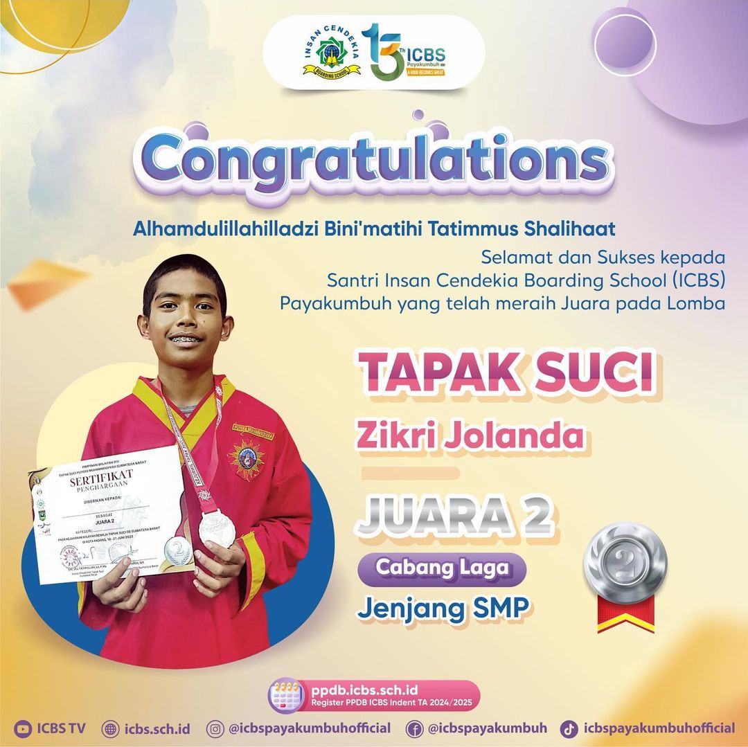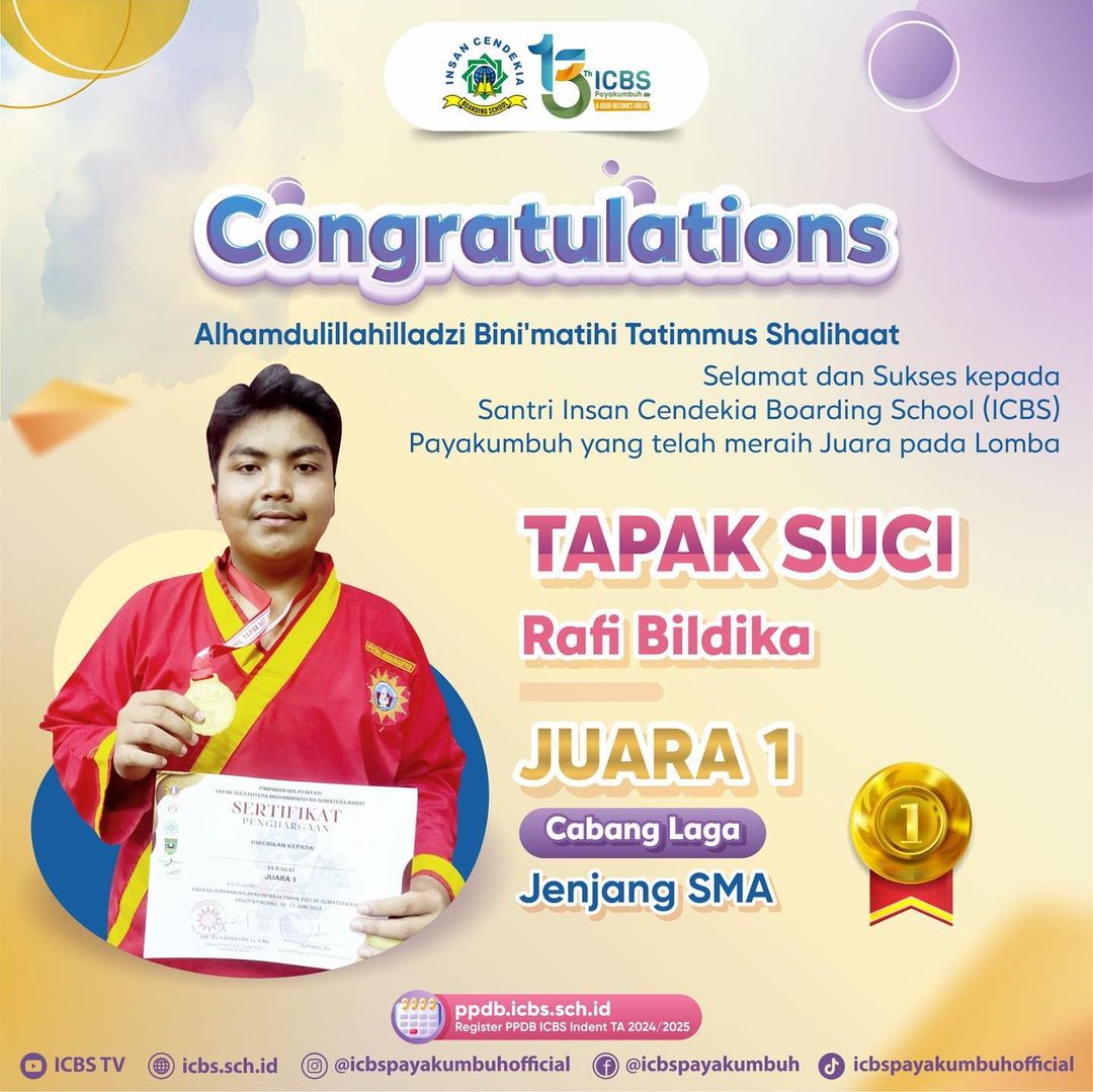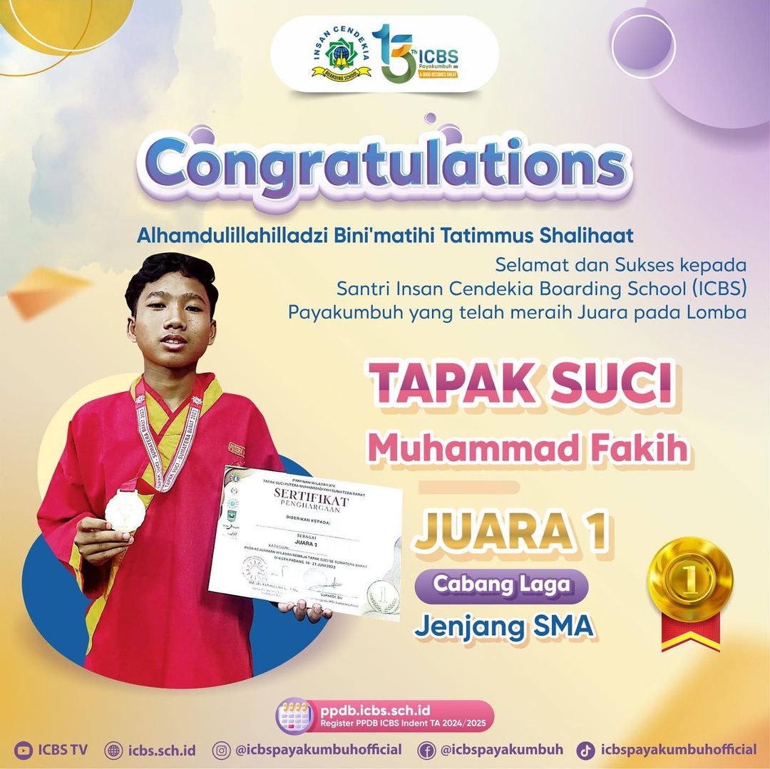 Sekali lagi, selamat kepada seluruh santri ICBS yang telah berhasil meraih medali emas dalam lomba Tapak Suci Provinsi Sumatera Barat. Semoga prestasi ini menjadi motivasi bagi kita semua untuk terus berprestasi dan mengharumkan nama ICBS di kancah nasional maupun internasional.
