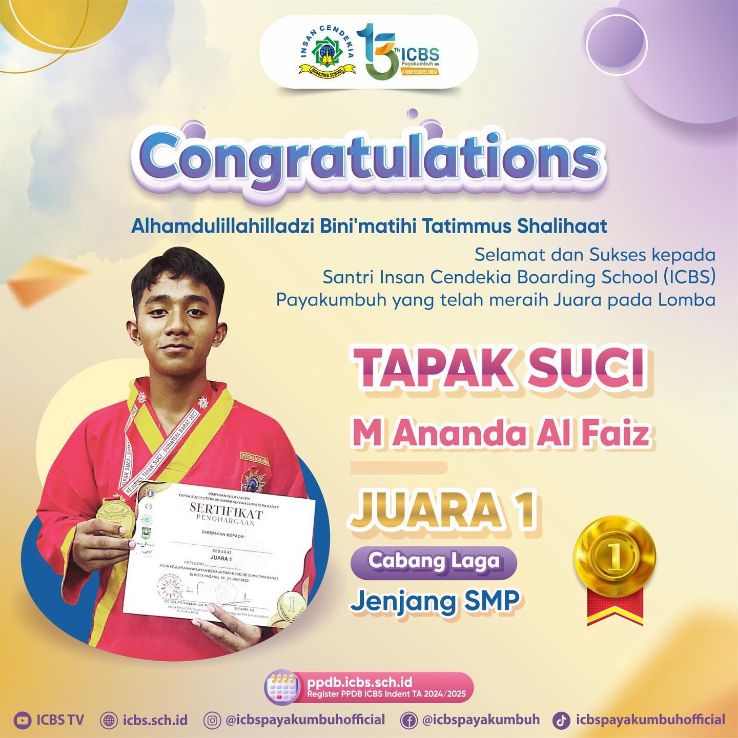 Kami bangga dengan pencapaian ananda , karena tidak mudah untuk meraih medali emas dalam lomba sekelas Tapak Suci Provinsi. Ini menunjukkan bahwa ICBS memiliki santri yang berbakat dan berprestasi.